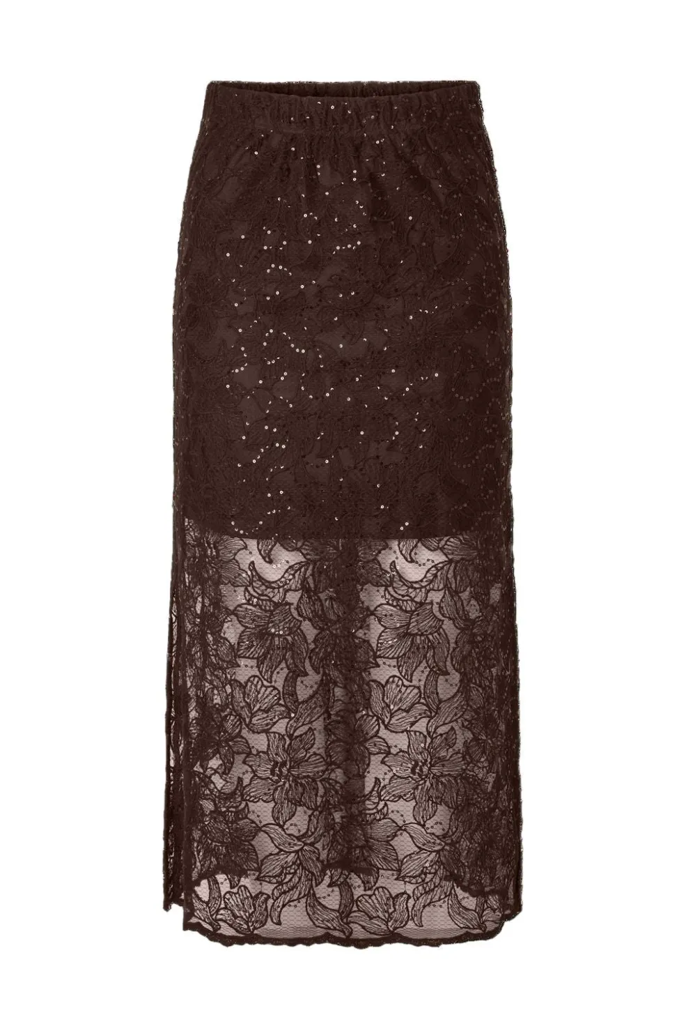 Nederdel fra Pieces i brun med små, skinnende pailletter og gennemsigtig blondekant nederst. Det blomstrede mønster giver nederdelen et feminint udtryk.