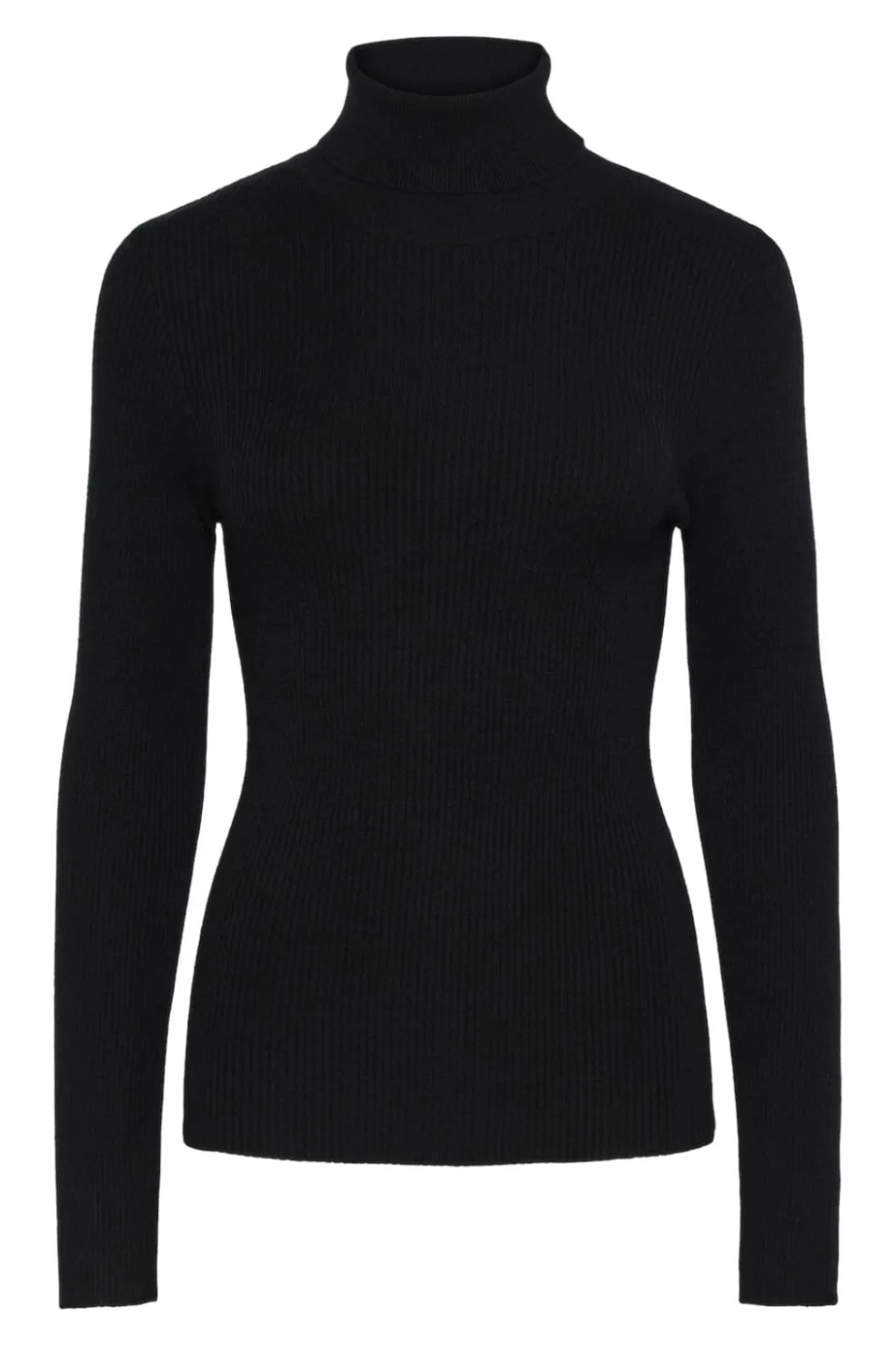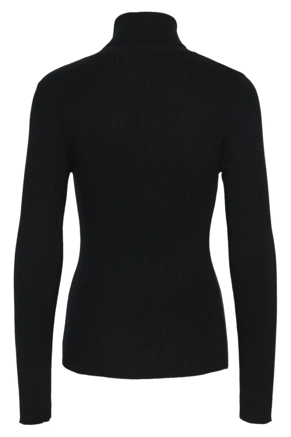 Sort rullekravestrik fra Pieces med ribstrikket konstruktion. Striktrøjen har lange ærmer og en tætsiddende pasform, der følger kroppens form.