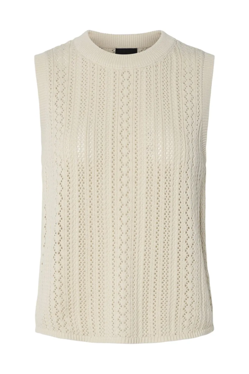 Ærmeløs strikbluse fra Pieces i en lys birch-farve. Blusen har et struktureret strikmønster med lodrette linjer og diamantformer, rund halsudskæring og regular fit.