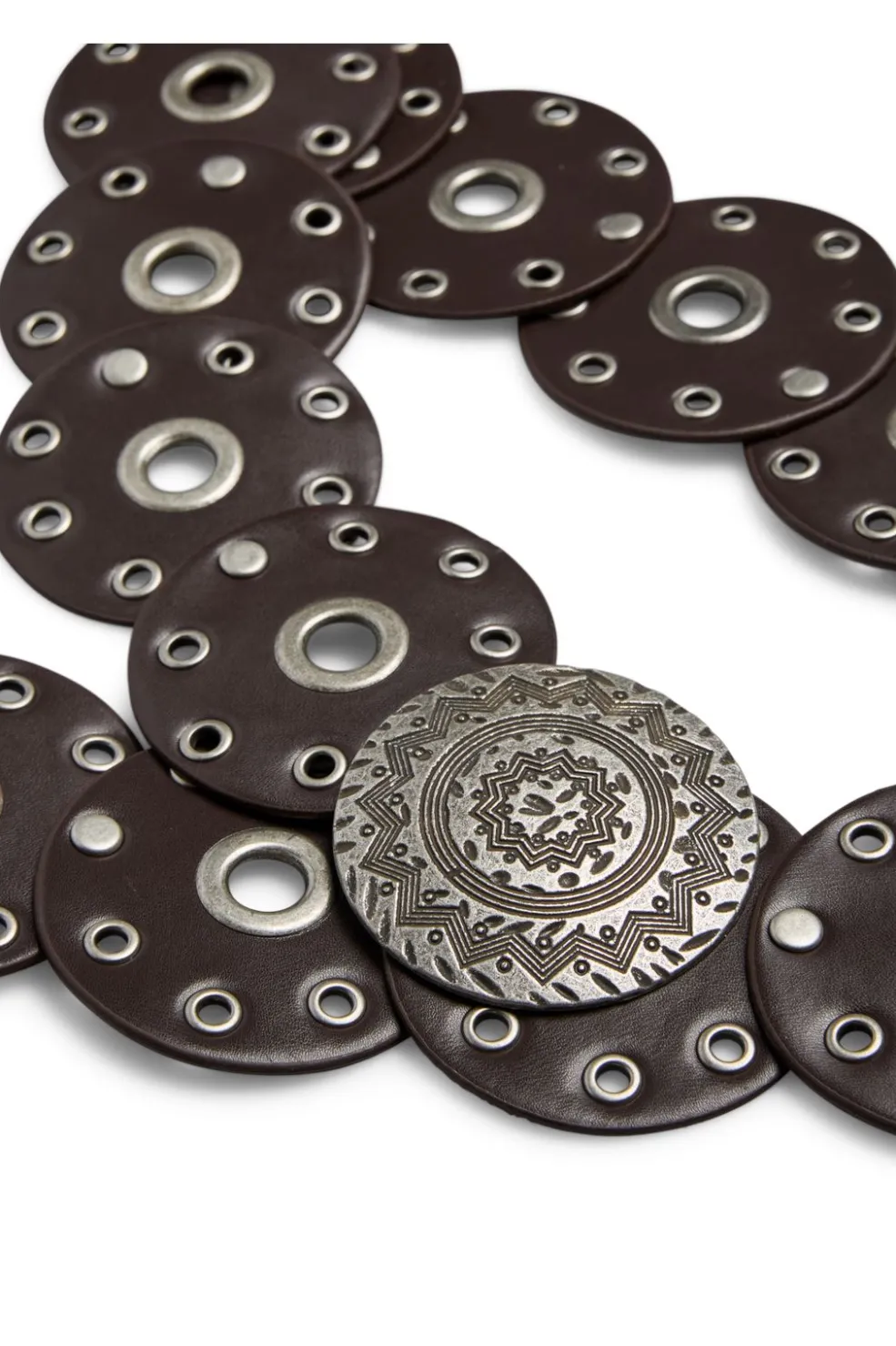 Brunt bælte fra Pieces med cirkulære elementer og nitter. Bæltet har et dekorativt metalelement i midten og er lavet af coated materiale med en læderagtig overflade.