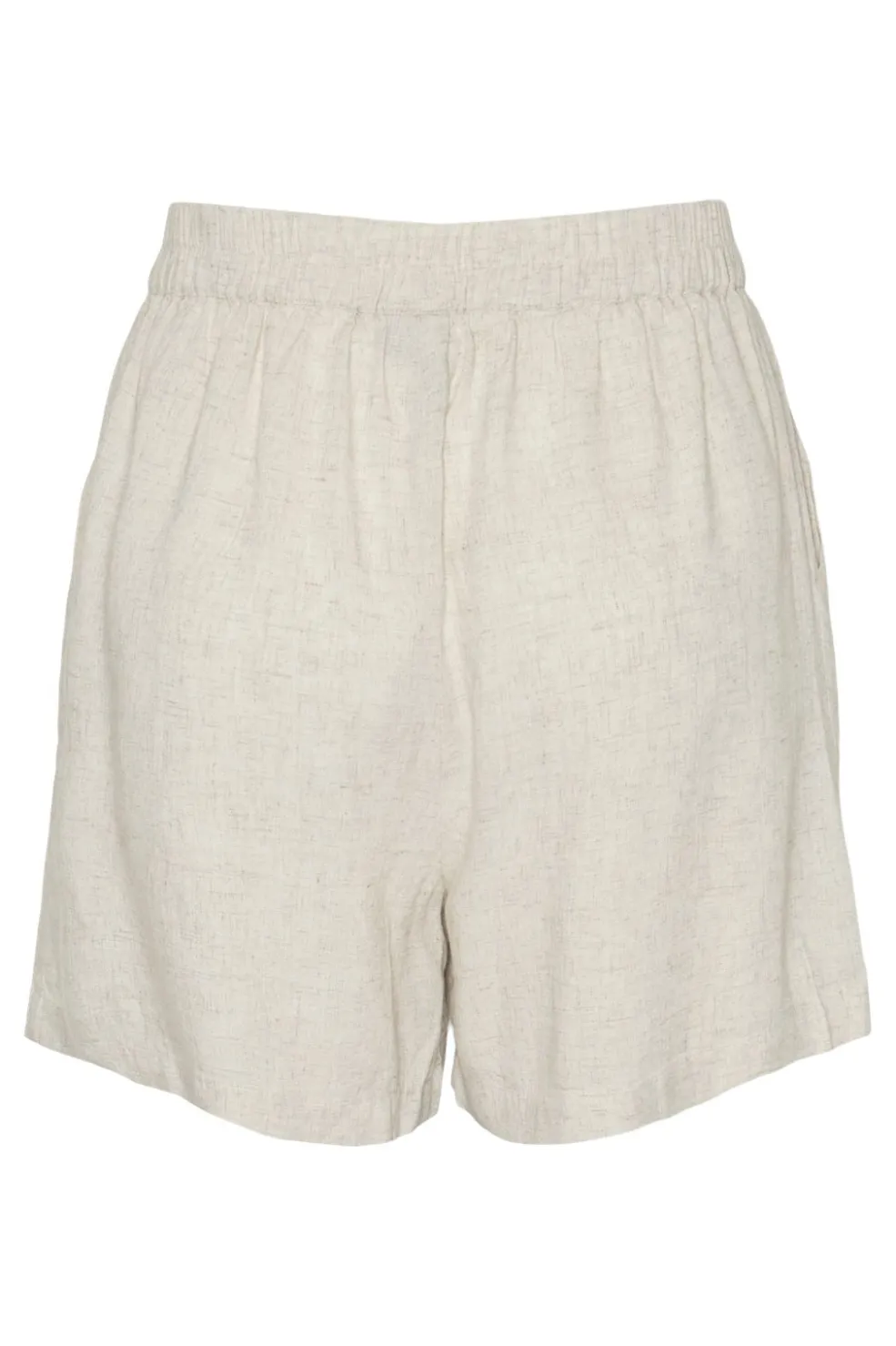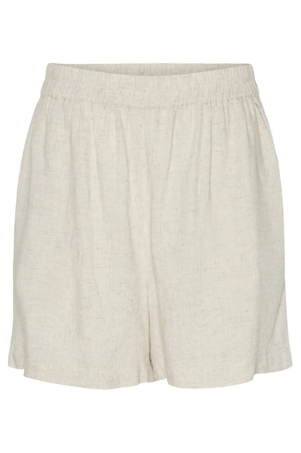 Shorts fra Pieces i en lys beige melange. De har en løs pasform og er lavet af vævet materiale med flæsedetaljer og elastisk taljebånd i livet.