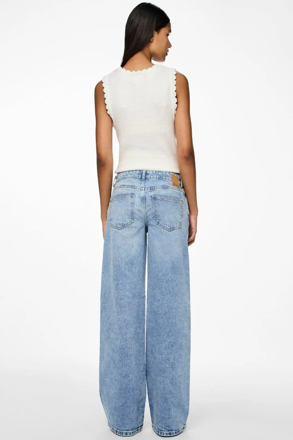 Lyseblå jeans fra Pieces med lav talje og wide leg-pasform. Bukserne har et videre snit i benene og er mere tætsiddende omkring hoften, hvilket giver en afslappet silhuet.