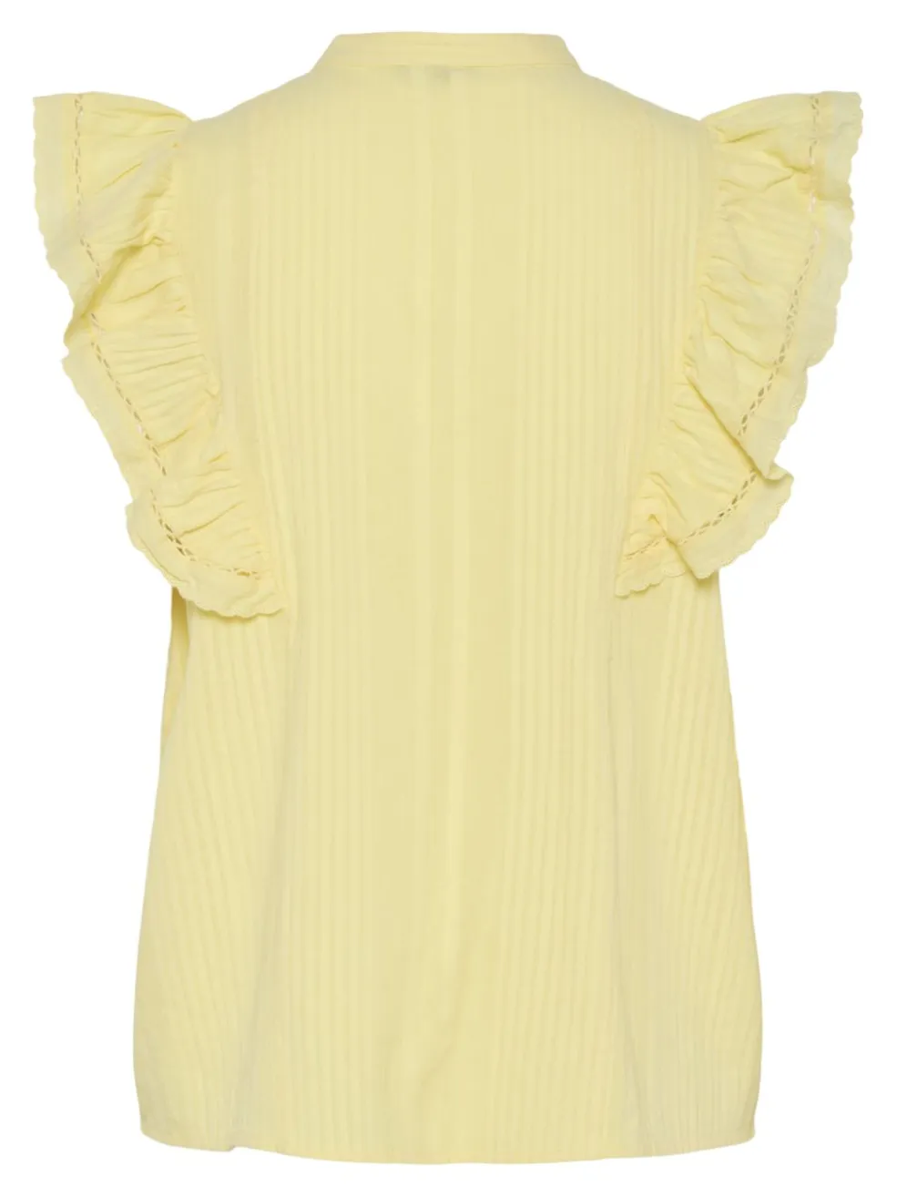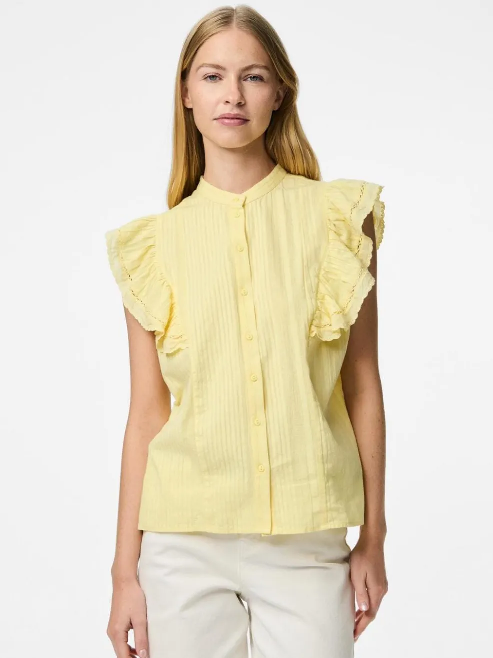 Gul skjorte fra Pieces i økologisk bomuld. Skjorten har knaplukning foran og flæser på ærmerne. Den korte ærmelængde og skjortekraven giver et rent og enkelt udtryk.
