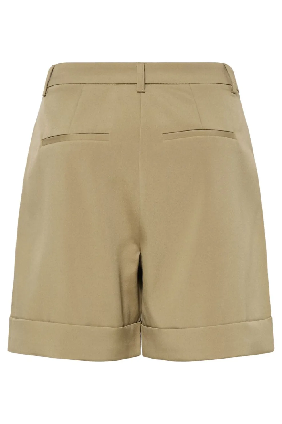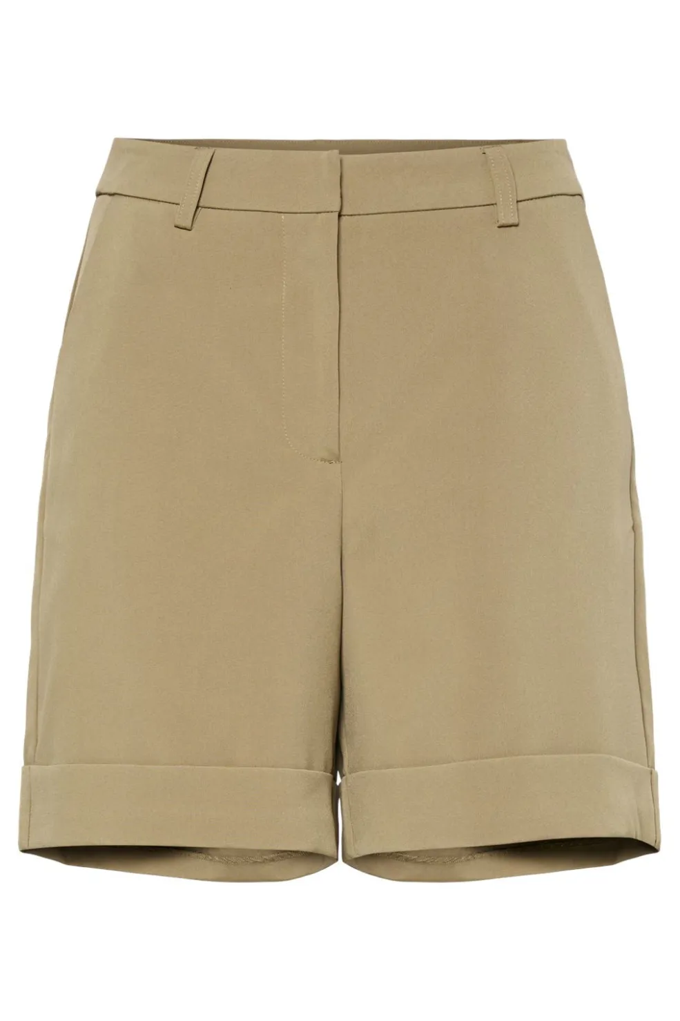 Khakifarvede shorts fra Pieces i vævet tekstil. Shortsene har en lårkort længde med rullet kant og praktiske detaljer som bæltestropper og fire lommer.