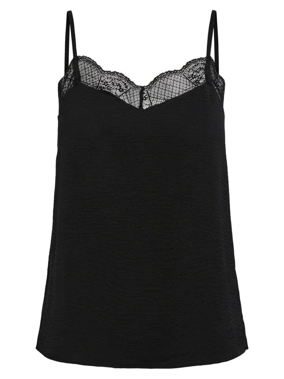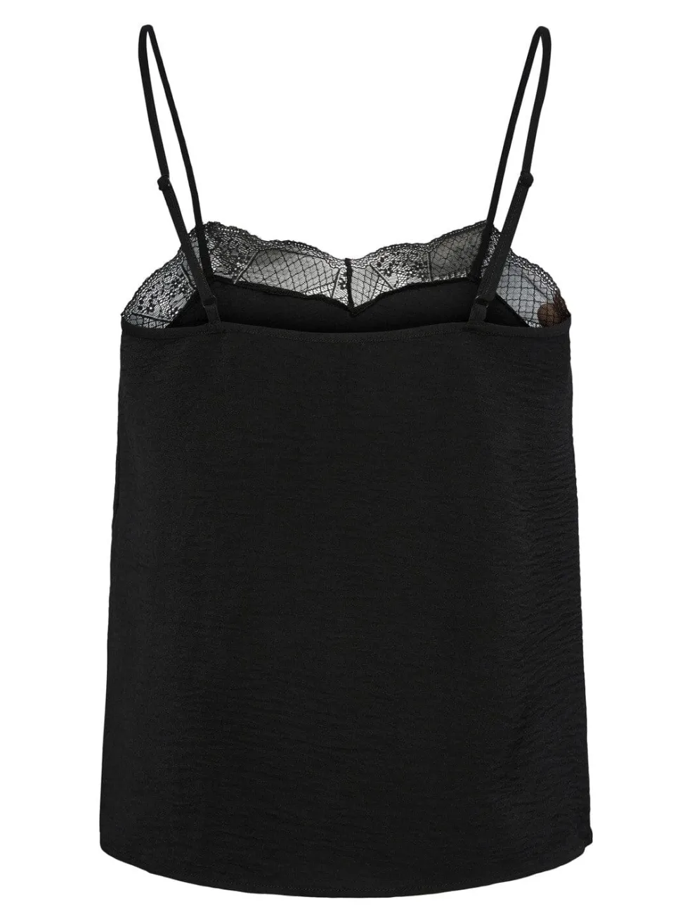 Sort top fra Pieces med tynde stropper og blondedetaljer. Toppen har en V-halsudskæring med blondekant og en let struktur, der giver den et enkelt udtryk.
