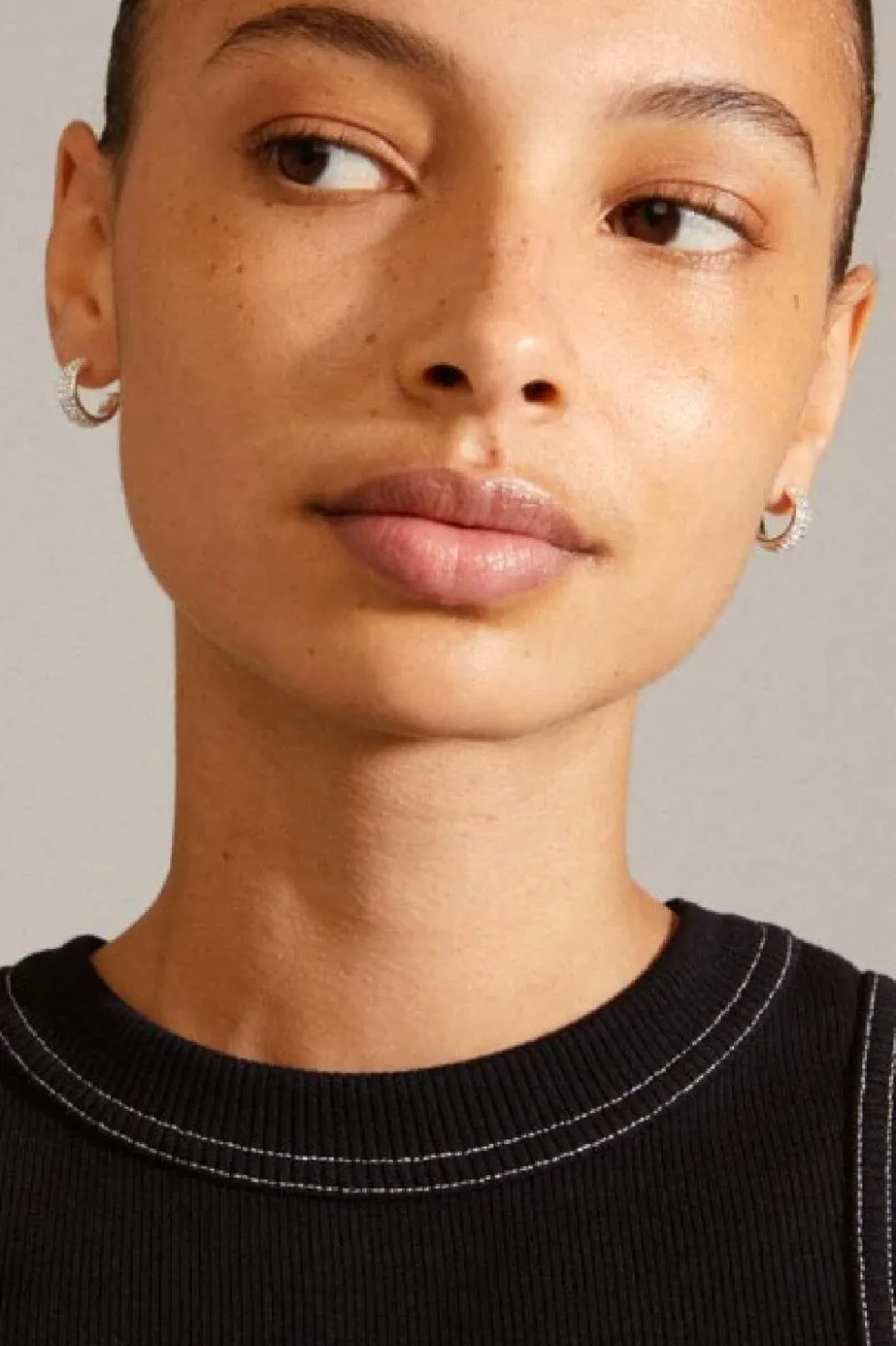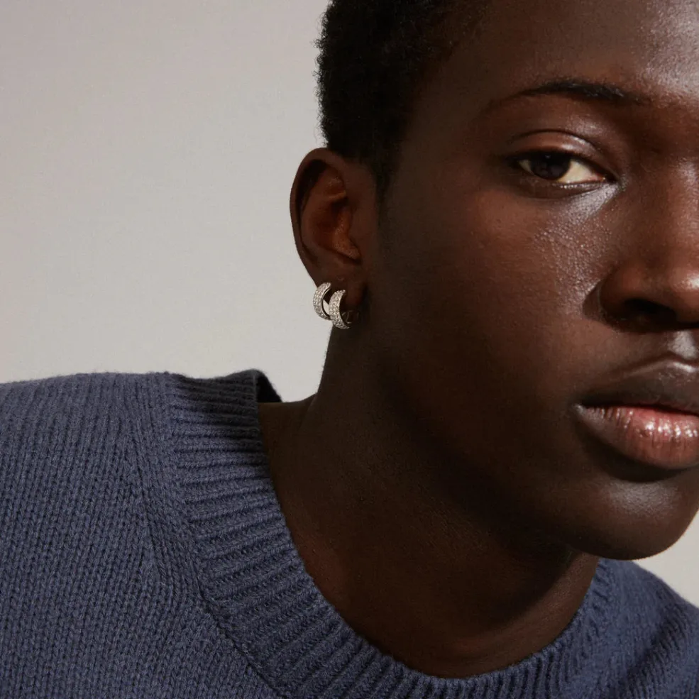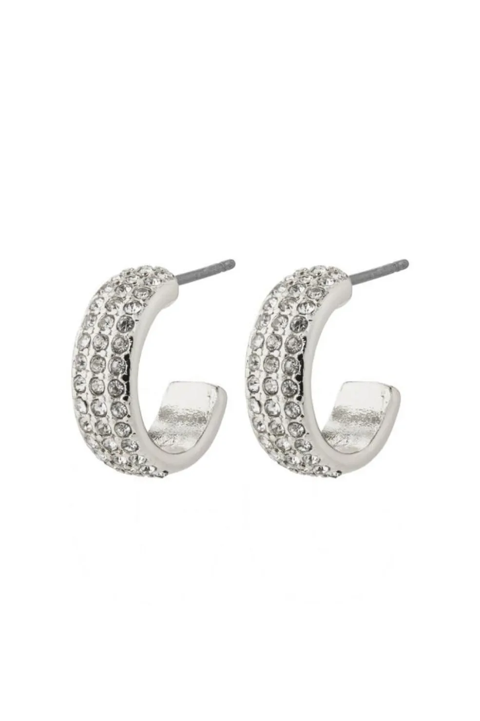 Sølvbelagte hoops-øreringe fra Pilgrim med Preciosa-krystaller. Øreringene har en blank overflade og er dekoreret med tre rækker af klare krystaller.