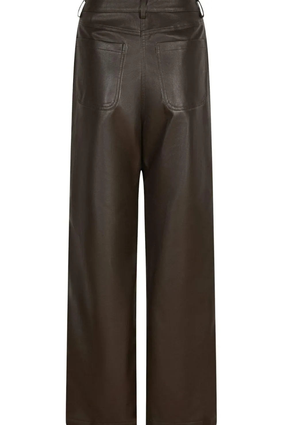 Mørkebrune bukser fra Neo Noir i faux læder med brede ben. Bukserne har gulvlængde og er udstyret med både for- og baglommer samt bæltestropper.