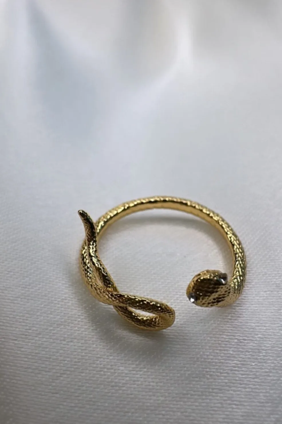 Ring fra O element med snoet design. To slangehoveder mødes i et unikt mønster, der giver ringen et karakteristisk udtryk. Ringen er lavet af messing med en gylden overflade.