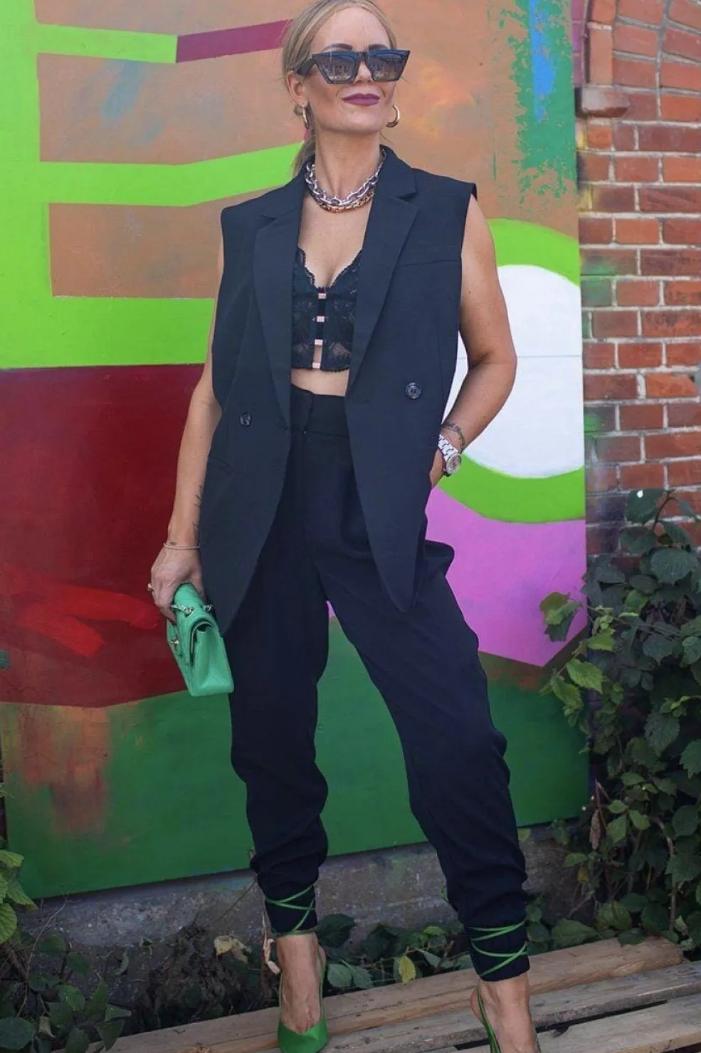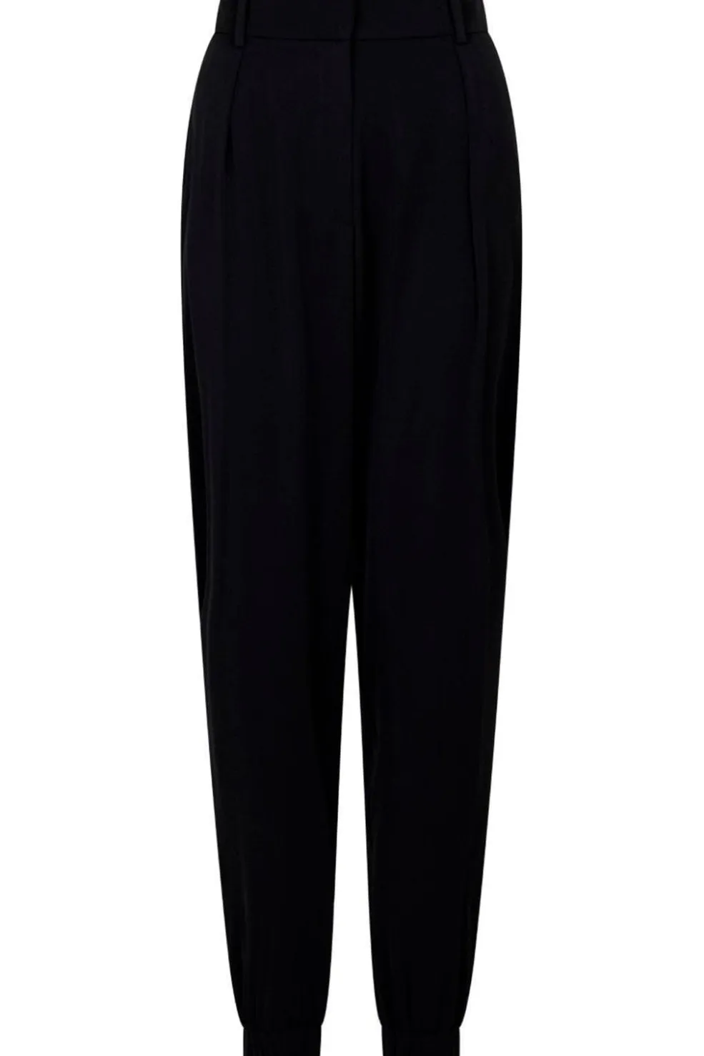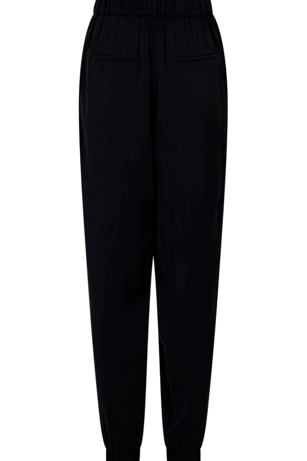 Sorte bukser fra Valentin Studio med draperinger foran. Bukserne har en løs pasform med elastik i taljen og ved anklerne.