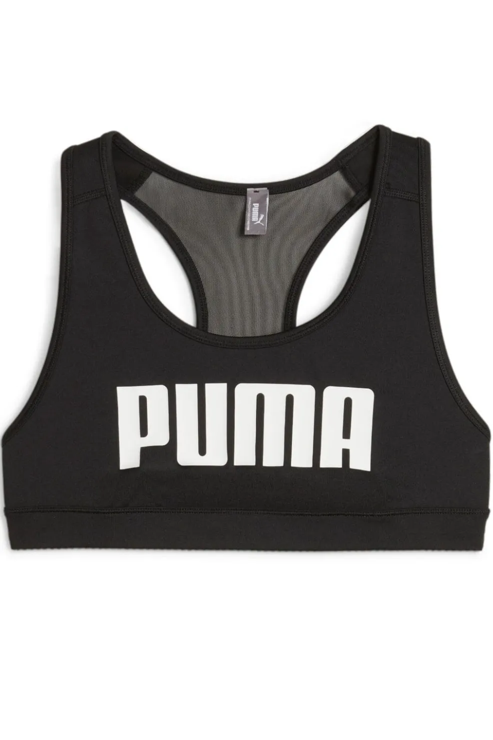 Sort sports-bh fra Puma med krydsede stropper på ryggen og bred elastik under busten. Den har medium støtte og mesh-konstruktion i ryggen til god ventilation under træning.