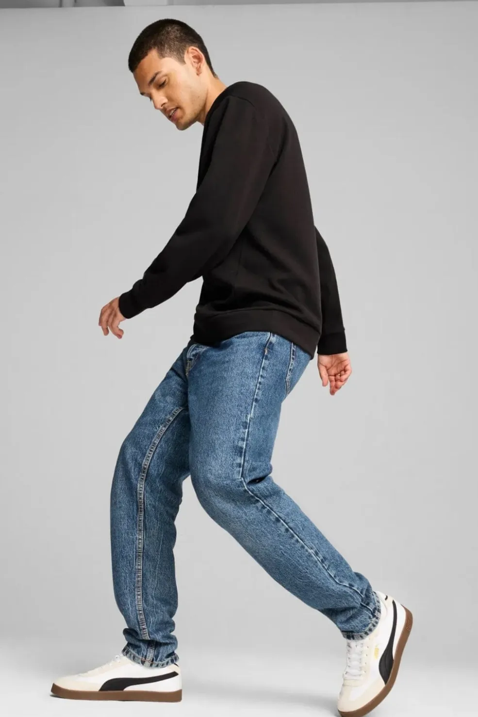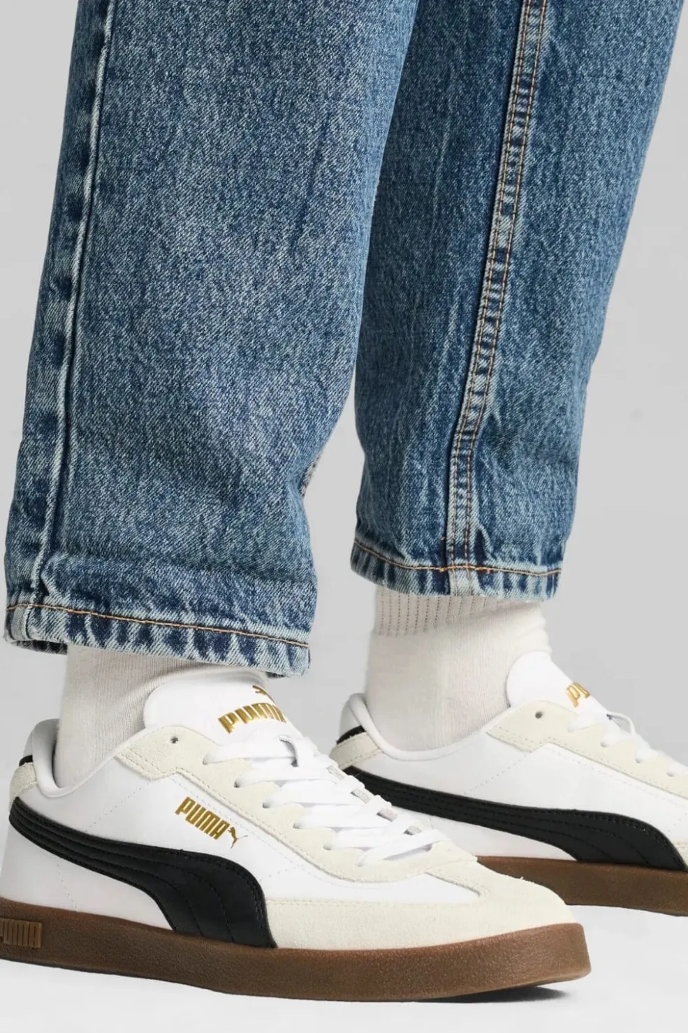 Hvid sneaker fra Puma med sorte detaljer. Skoen har en klassisk sporty silhuet med ruskindspaneler og syntetisk læder på overdelen.