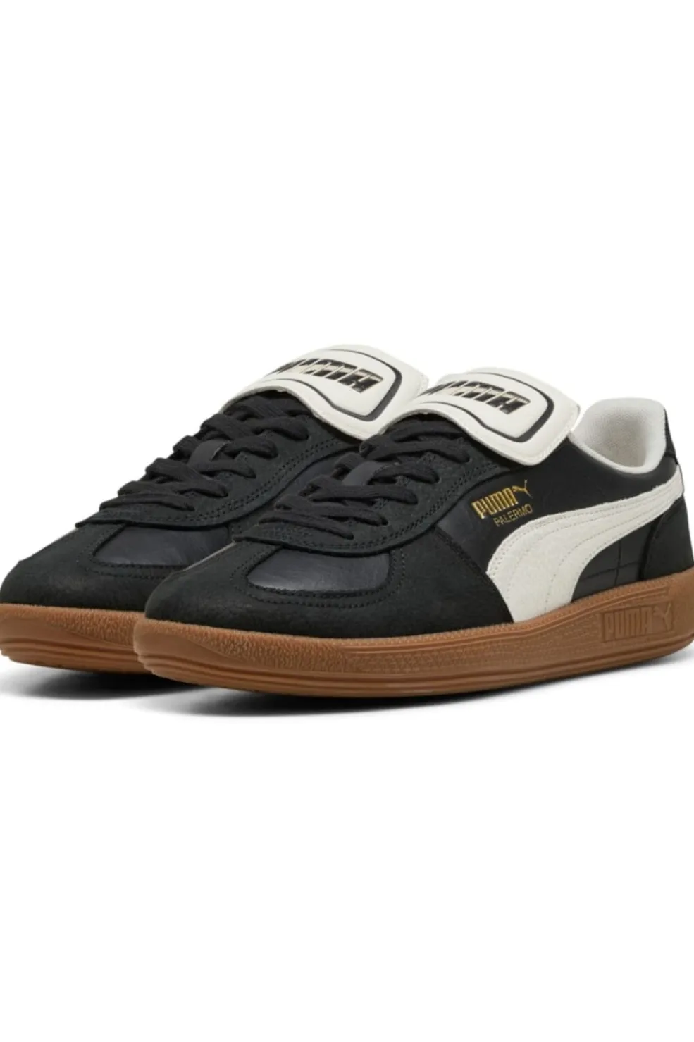 Sort sneaker fra Puma med læderoverdel og brun gummisål. Sneakeren kombinerer både snørebånd og velcrolukning med en rund tåform og klassisk design.