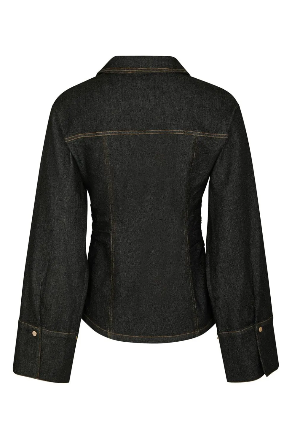 Sort denimskjorte med skrå syninger og flæsedetaljer. Skjorten har en kropsnær pasform med brede ærmer og manchetter. Den strukturerede krave og bløde denim giver et klassisk udtryk.