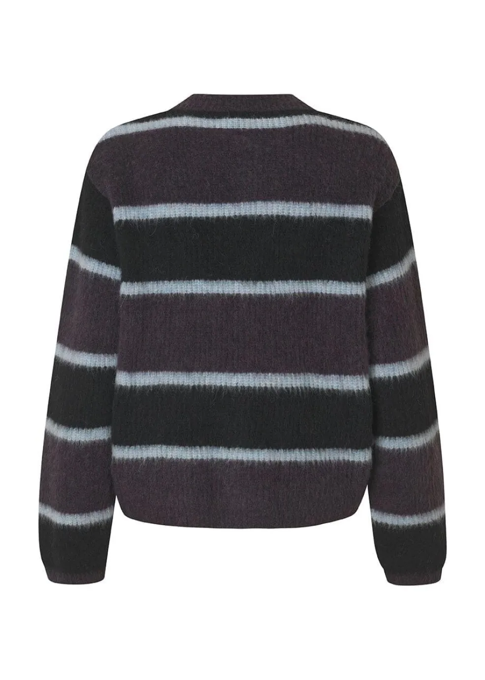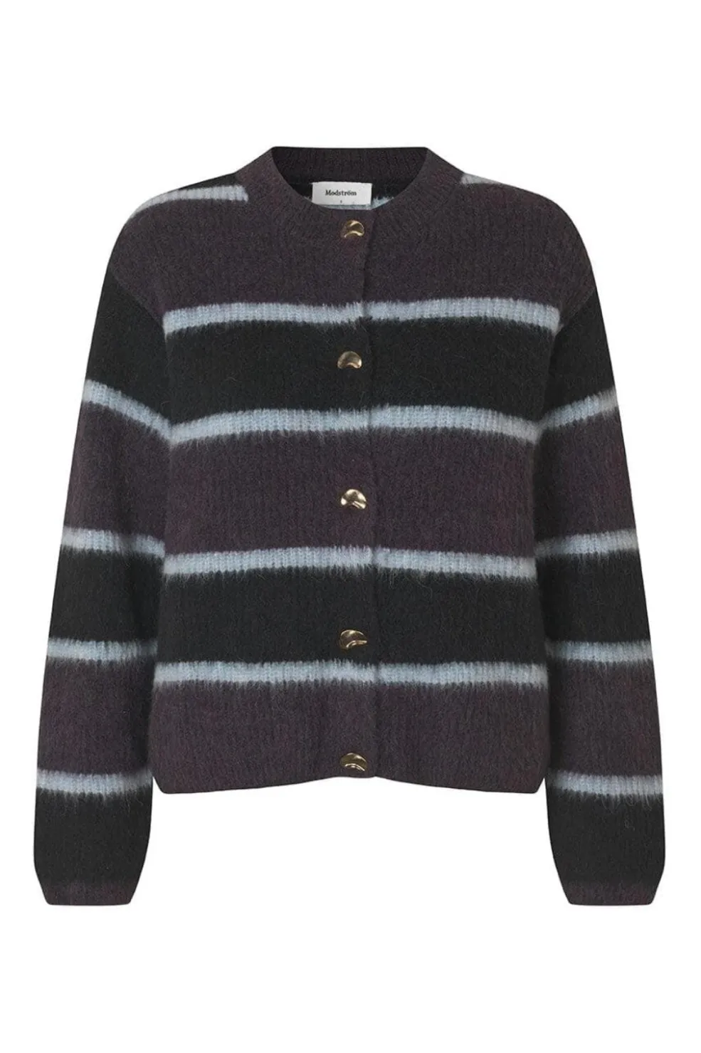 Stribet cardigan fra Modström i mørkeblå og grå nuancer. Den har en rund halsudskæring og knapper foran.