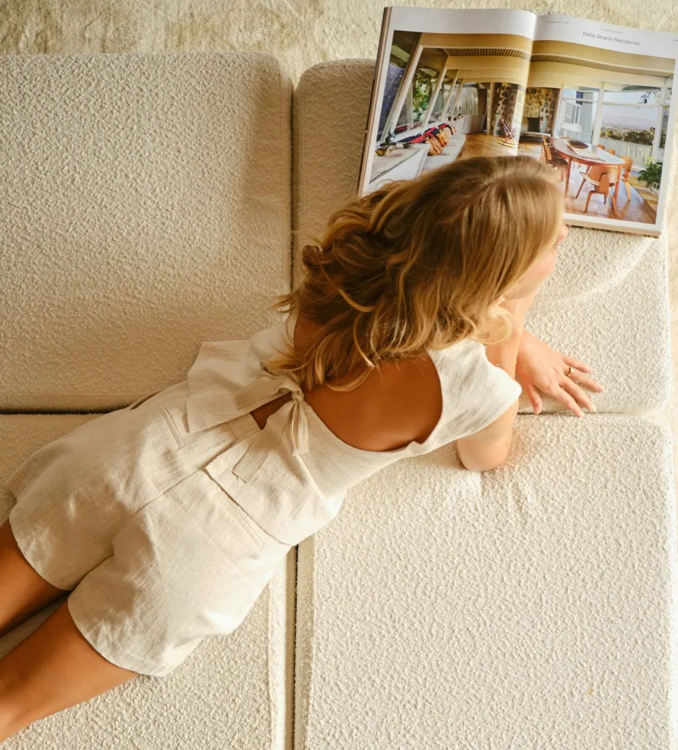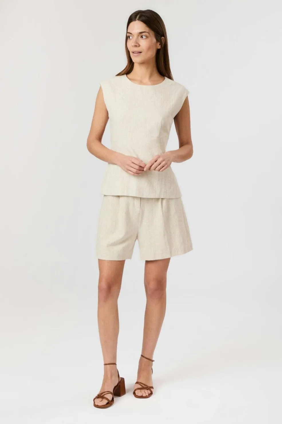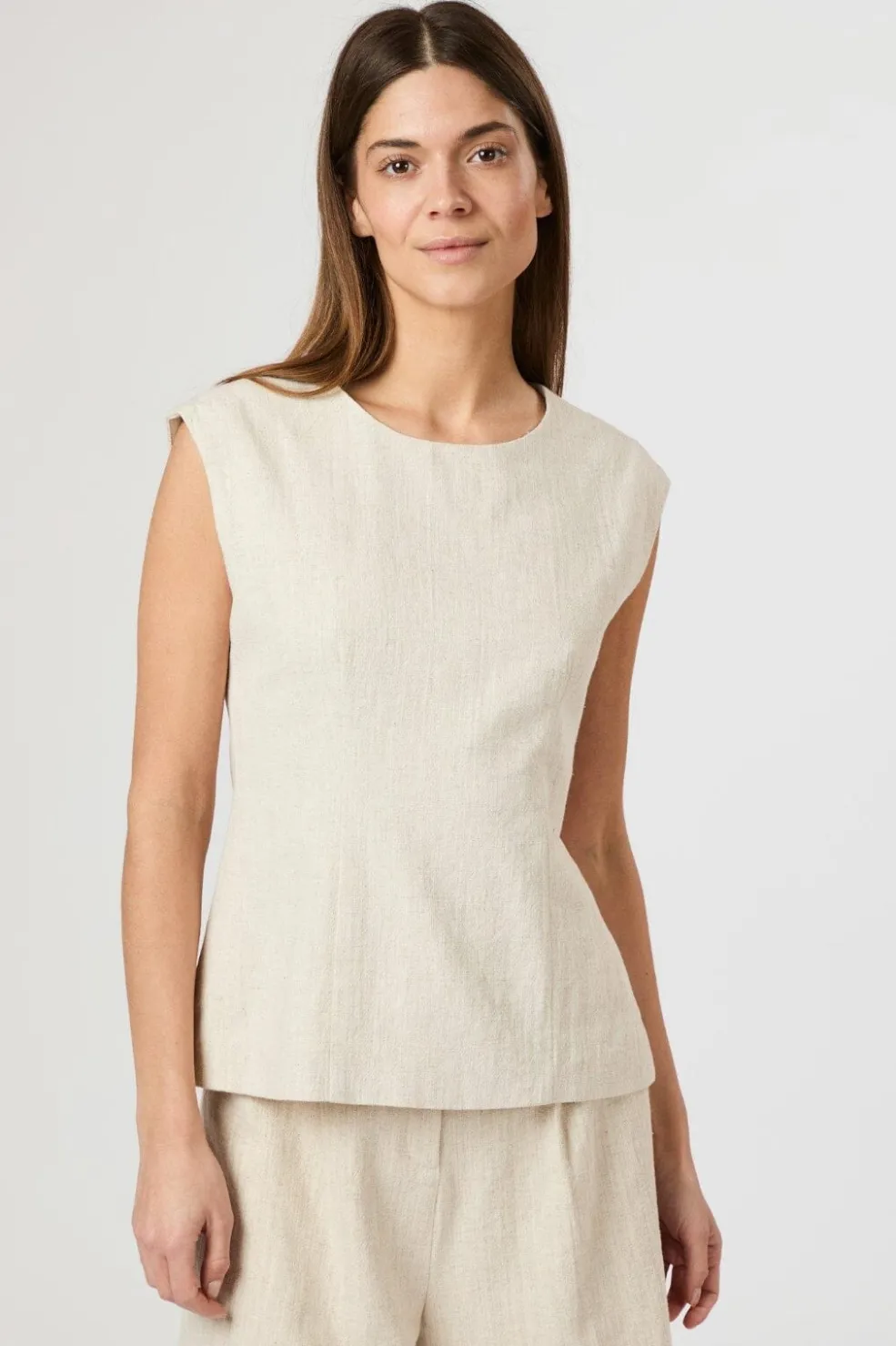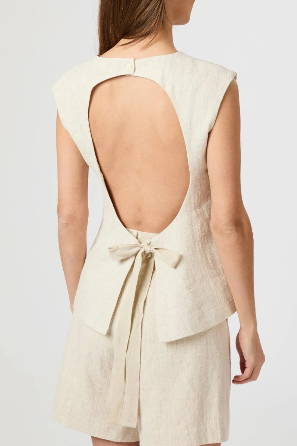 Ærmeløs top fra Neo Noir i naturfarvet ramie-stof. Toppen har en åben ryg med knapper i nakken og bindedetalje nederst på ryggen.