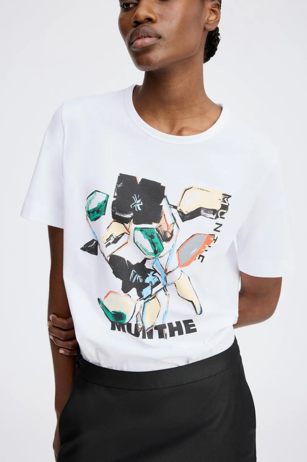 Hvid t-shirt fra Munthe med kunstnerisk print i flere farver. T-shirten har en rund halsudskæring og korte ærmer med et diskret logo på ærmet.