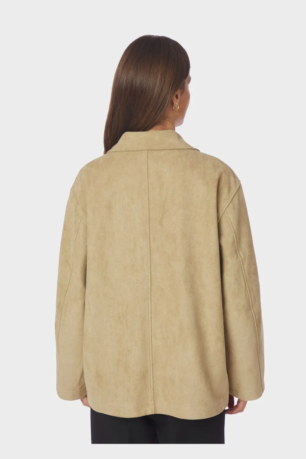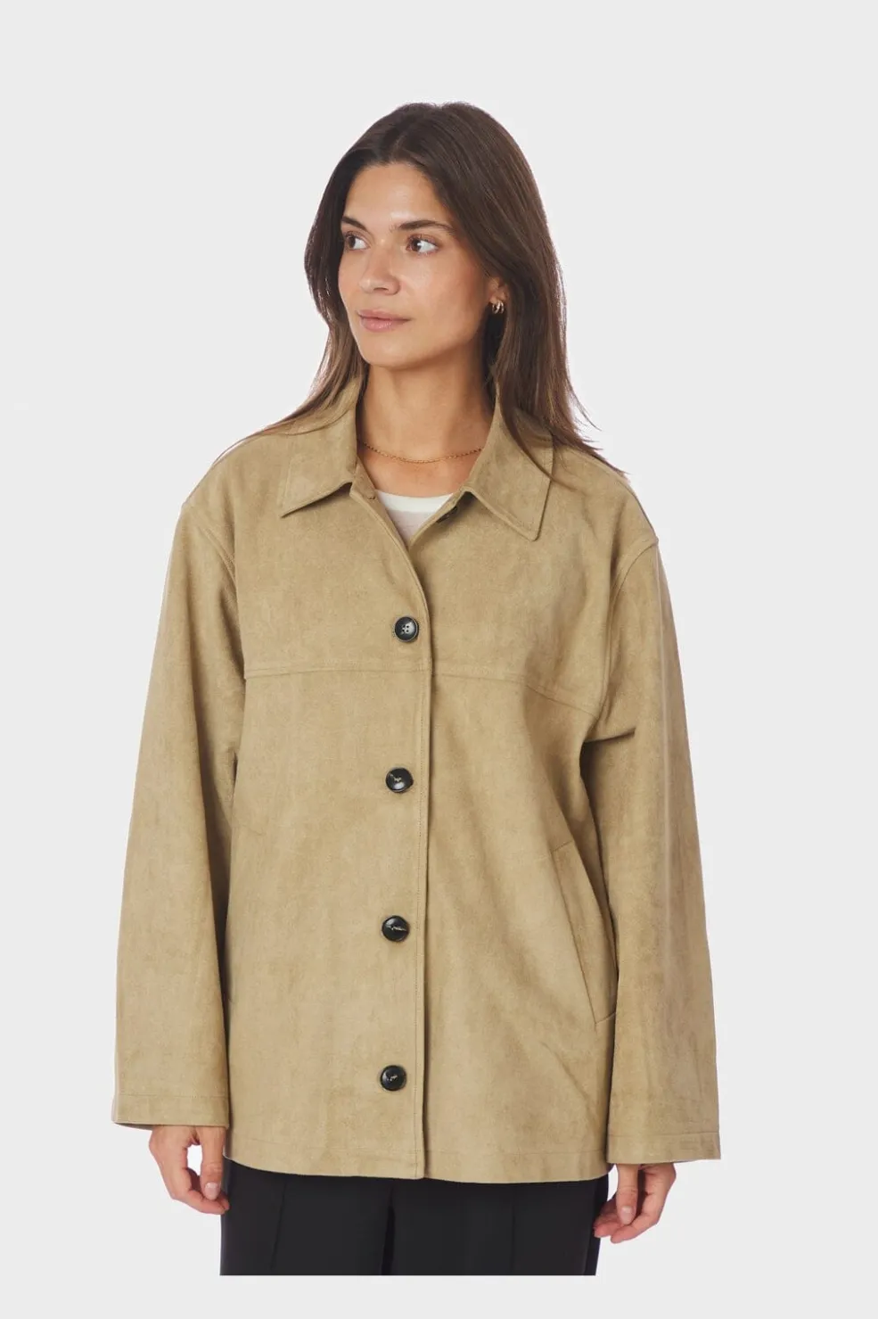 Sandfarvet jakke fra Neo Noir i faux ruskind. Jakken har en skjortekrave, sorte knapper og dekorative syninger, der giver struktur til designet.