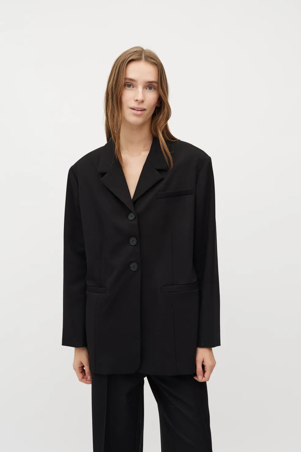 Sort blazer fra MbyM med klassisk design. Blazeren har fire knapper foran, to lommer og en traditionel krave med revers.