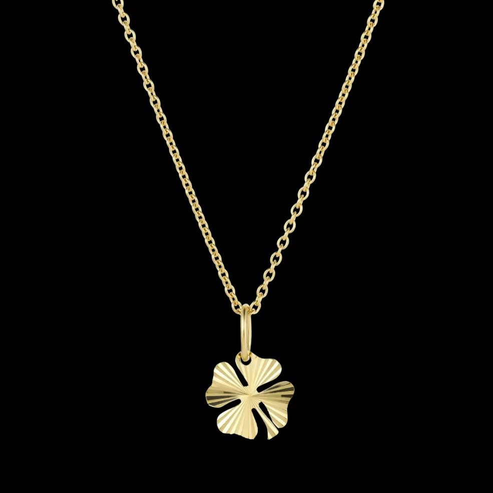 Forgyldt kløvervedhæng fra Jane Kønig med ribbet overflade. Vedhænget er fremstillet i sterling sølv med 18 karat guldbelægning og har en højde på 10 millimeter.