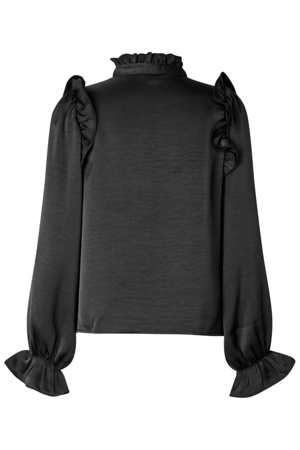 Sort bluse fra MbyM med rynkede detaljer. Den høje krave har fine flæser, og blusen har knapper foran. De puffede ærmer giver blusen et festligt præg.