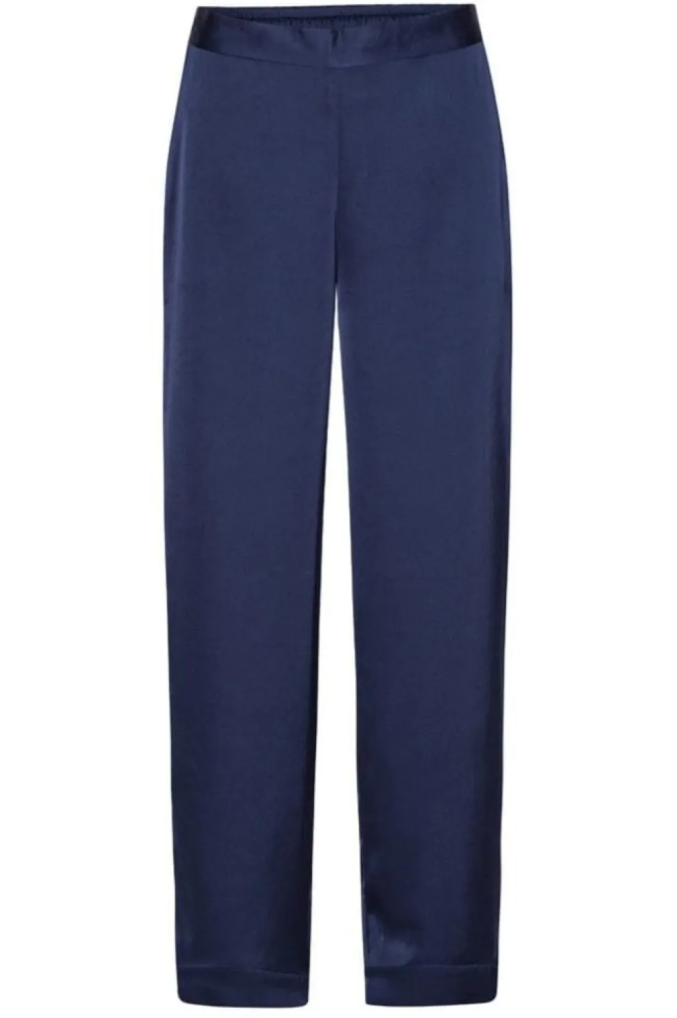 Mørkeblå bukser fra Karmamia med ankellængde og elastisk linning. Bukserne har en lige benform og en glat overflade med flot glans.