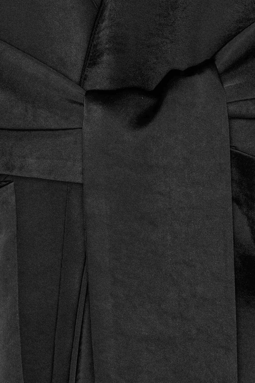 Sort blazer fra Karmamia i kraftig satin med foer. Blazeren har et påsyet bælte, der kan bindes både foran og bagpå, samt to forlommer og reverskrave.