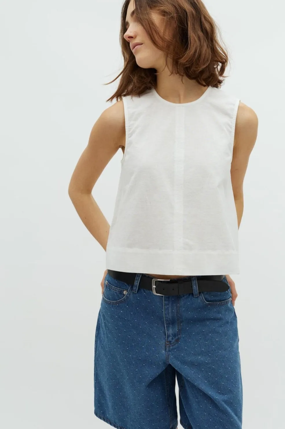Hvid top fra Global Funk i en let blanding af bomuld og hør. Toppen har en rund halsudskæring og en lille åbning med knap i nakken. Den ærmeløse stil gør den luftig at have på.
