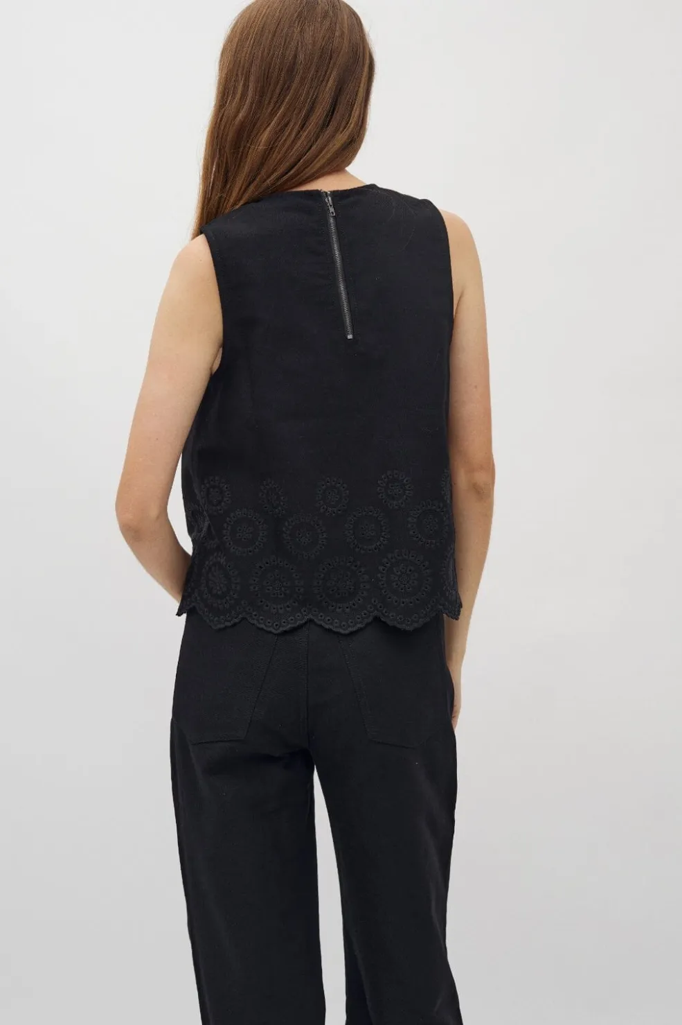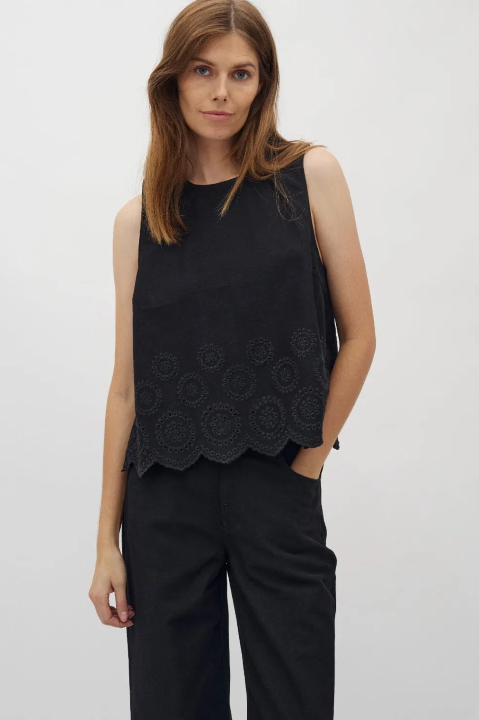 Sort top fra Global Funk med broderi og scallop-kant. Toppen har en rund halsudskæring og et ærmeløst design med dekorative udskæringer langs bunden.