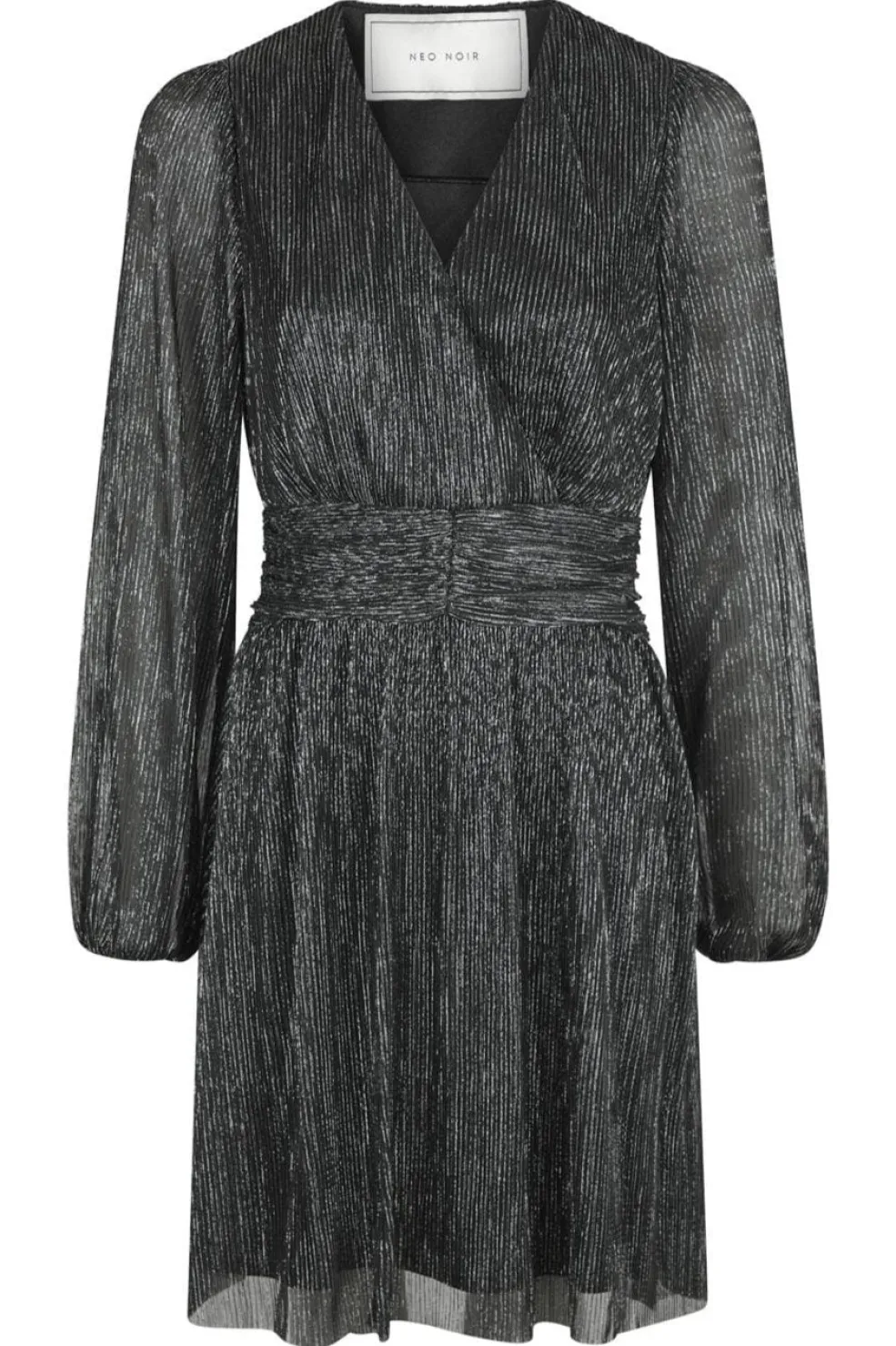 Sølvfarvet festkjole fra Neo Noir med glittereffekt. Kjolen har et plisseret design med flæser og V-udskæring. De lange ærmer og lår-længden giver kjolen et balanceret udtryk.