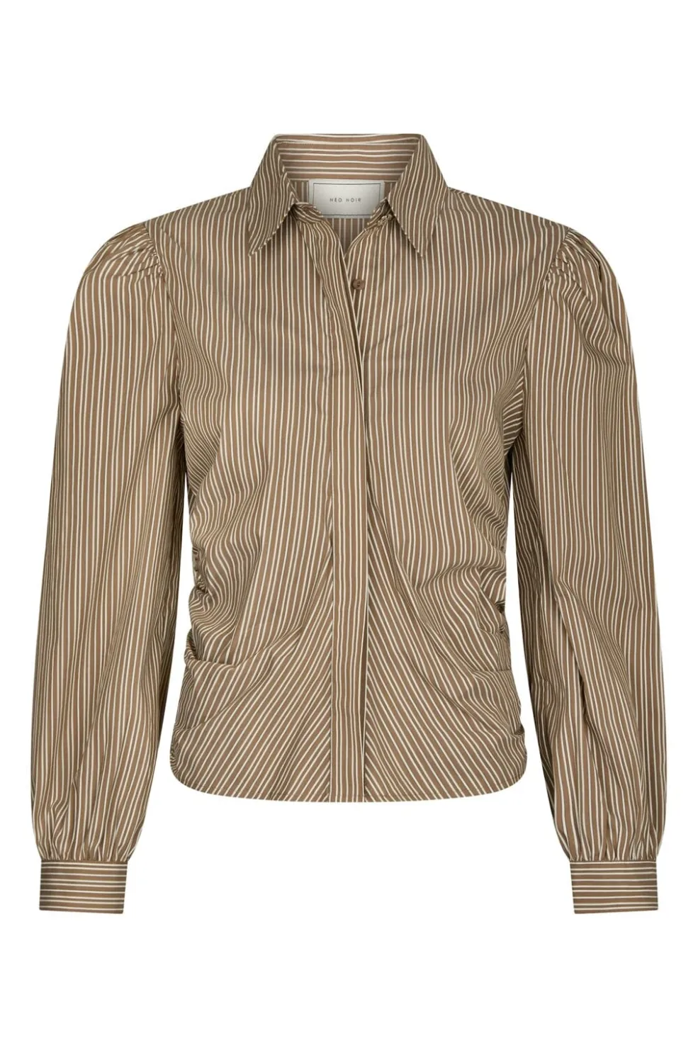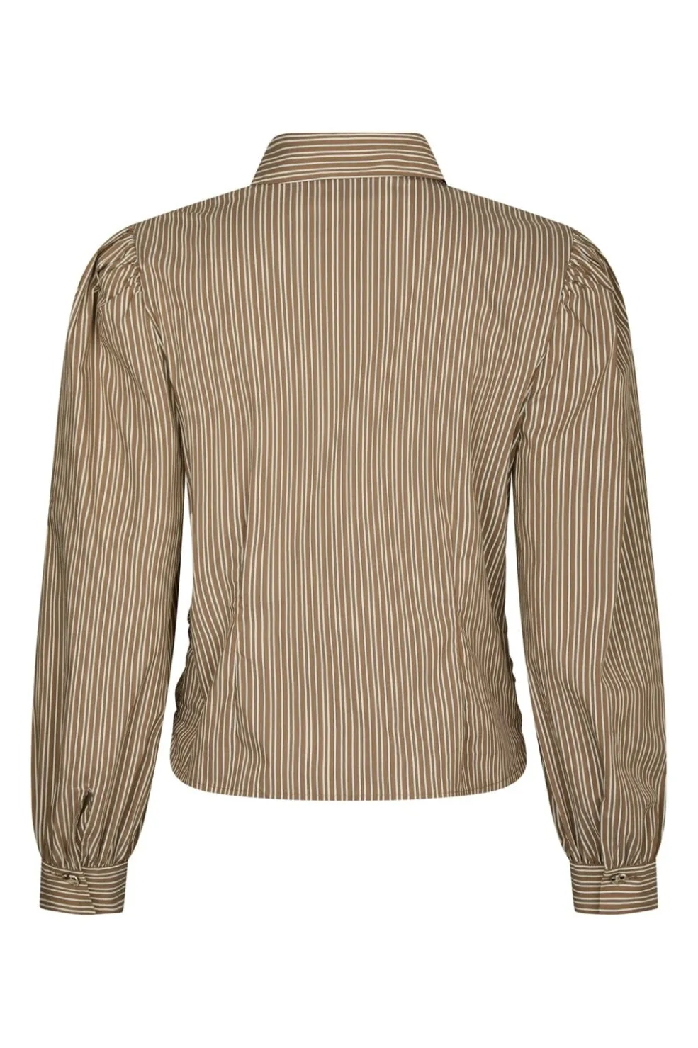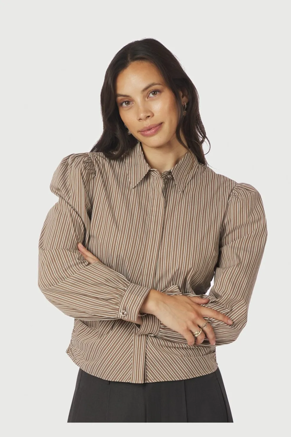 Stribet skjorte fra Neo Noir i lys brun. Skjorten har puffede ærmer med samlinger ved skuldrene og manchetterne samt en klassisk skjortekrave med dekorativ knap.