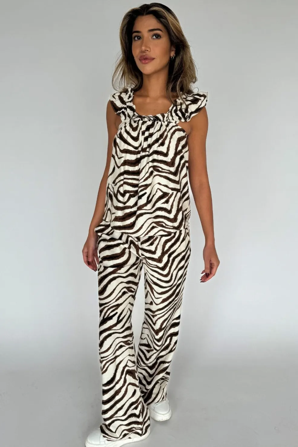 Bukser fra Continue med zebramønster i brune og hvide nuancer. De lange bukser har en afslappet pasform og rynkede detaljer ved anklerne.