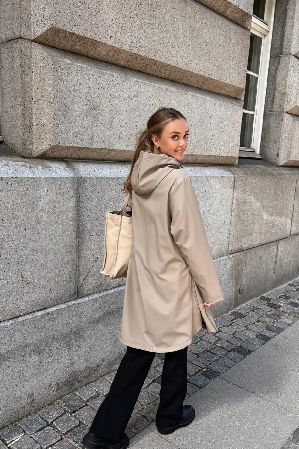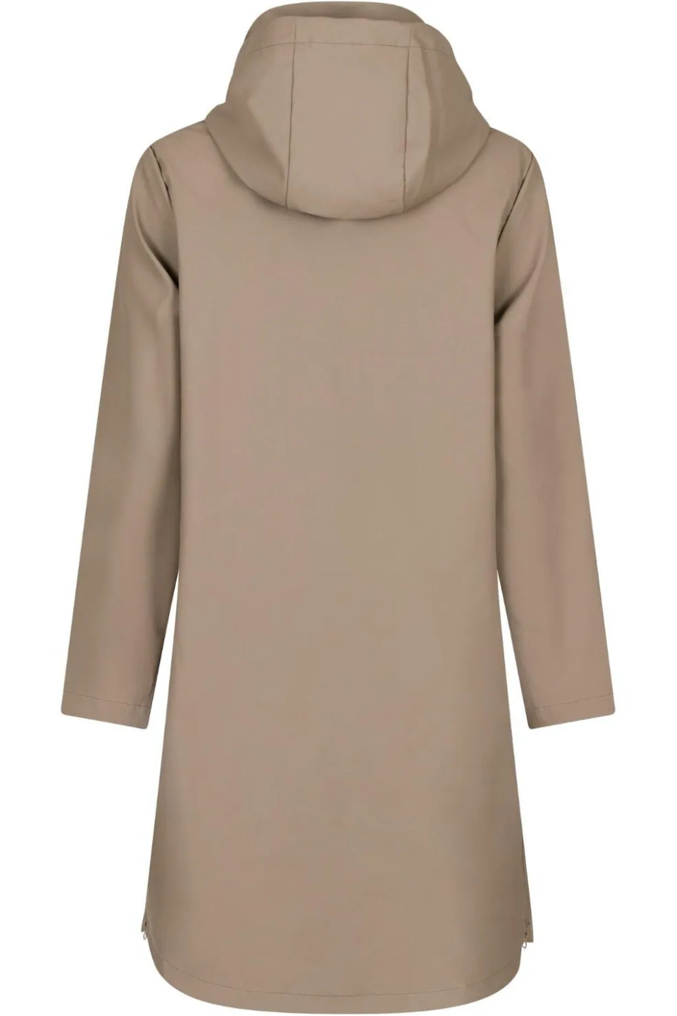 Knælang jakke fra Neo Noir i taupe. En regntæt jakke med høj hals og praktisk sidelynlås. Jakken har en god længde, der beskytter mod regn og vind.