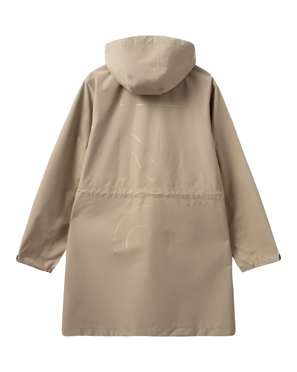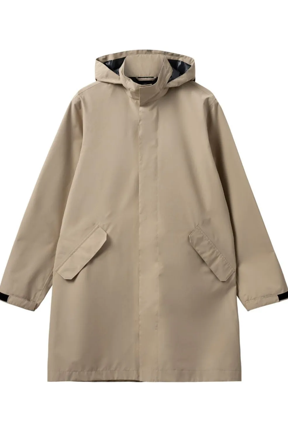 Lang regnjakke fra H2O i varm grå. Fremstillet af genbrugt polyester med vandtæthed på 3000 mm og åndbarhed på 800 g/m²/24 timer for god beskyttelse mod regn.