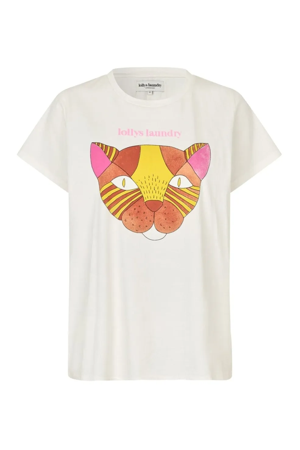 Hvid T-shirt fra Lollys Laundry med et farverigt katteansigt trykt på forsiden. De korte ærmer og den runde hals giver T-shirten et klassisk udtryk.