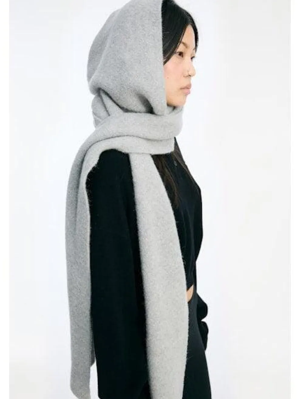 Strikket hætte-tørklæde fra Rotate i en lysegrå nuance. Designet kan bæres både som hætte og tørklæde.