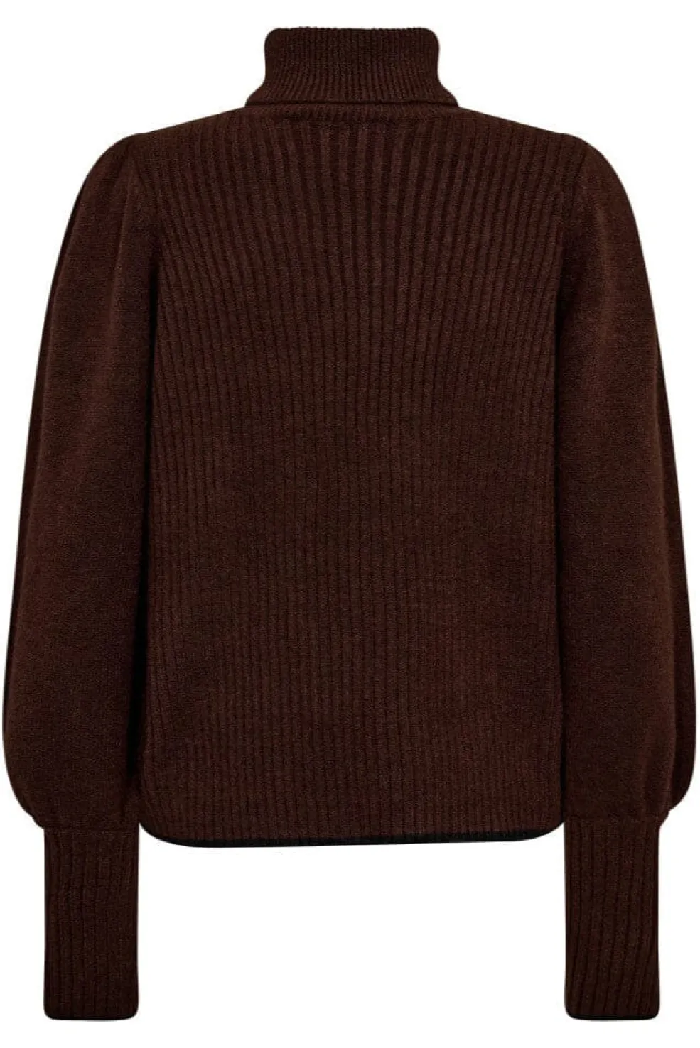Mørkebrun sweater fra Co´Couture med ribbet tekstur over hele trøjen. Den har pufærmer og en høj rullekrave.
