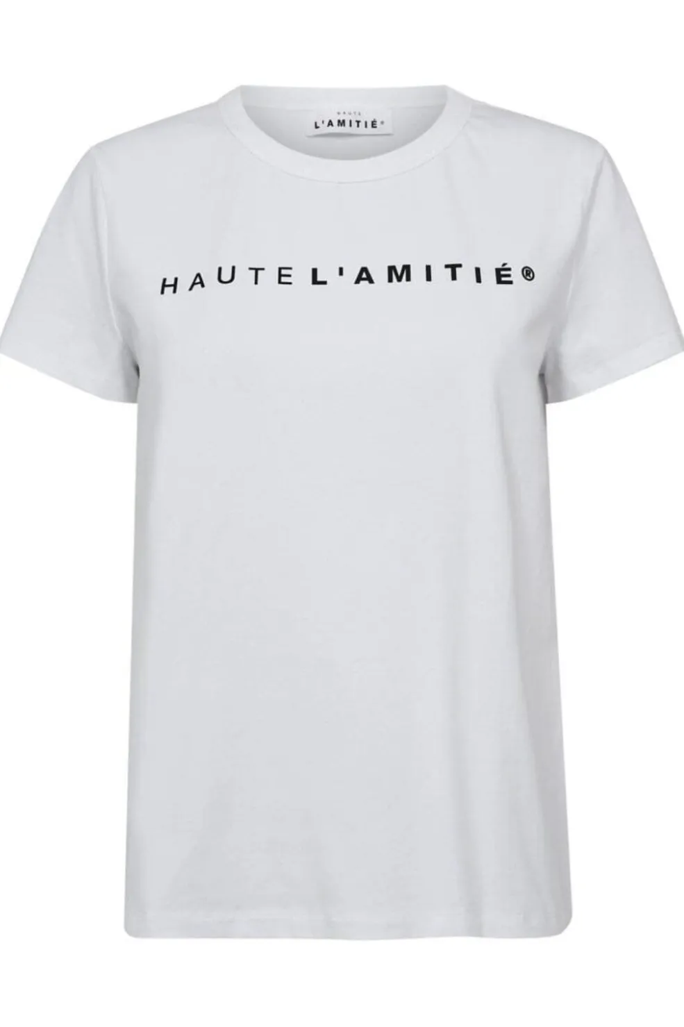 Hvid t-shirt fra Haute L’Amitié med sort logo på brystet. T-shirten er lavet af 95 % bomuld og 5 % elastan.