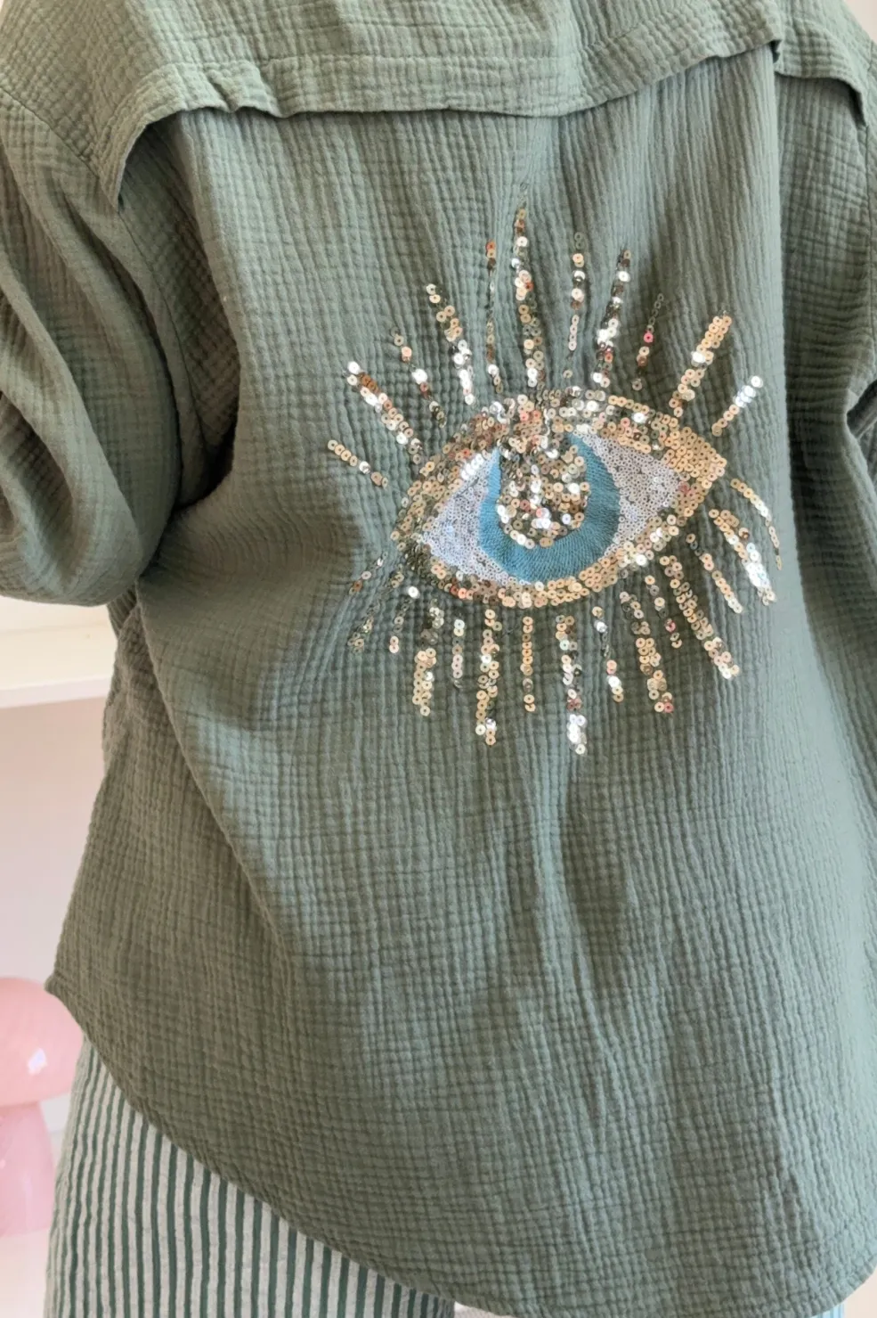 Khaki skjorte fra A-bee med struktureret bomuldsstof. På ryggen sidder et dekorativt øjemotiv med palietter, og ærmerne har let puf ved skuldrene.