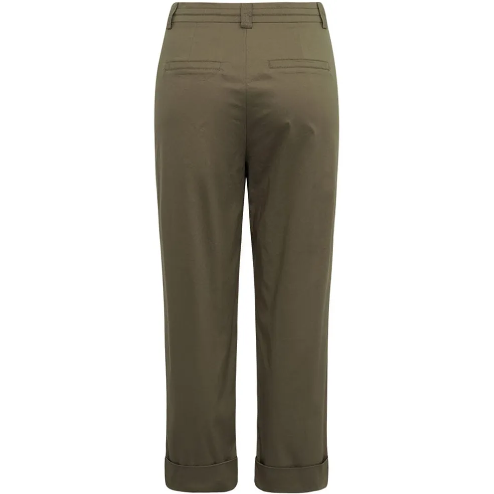 Khaki-brune bukser fra Gossia med løs pasform og høj talje. Bukserne har folder foran og en praktisk snørelukning i taljen. Ankellængden gør dem nemme at style.