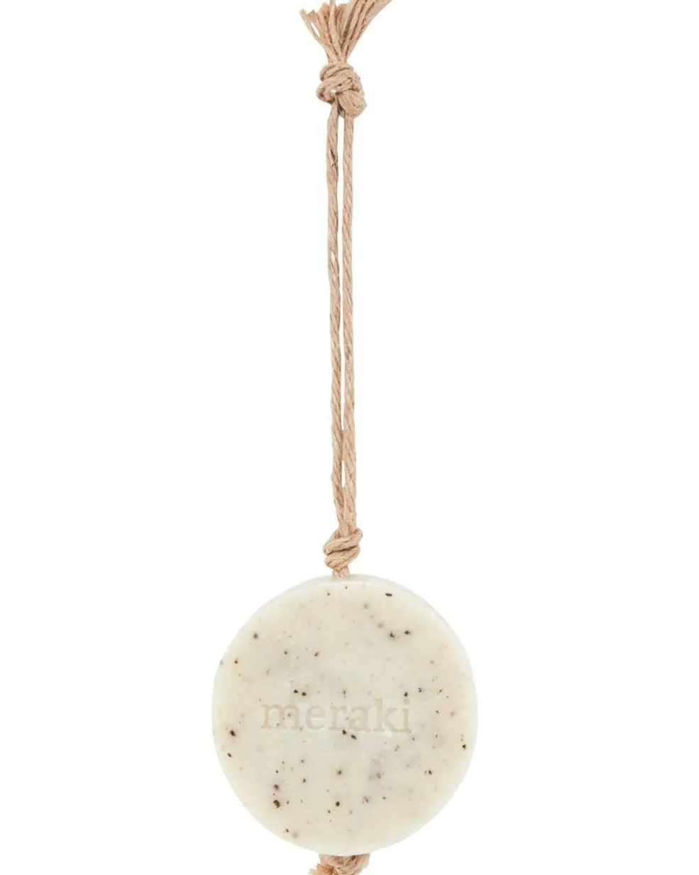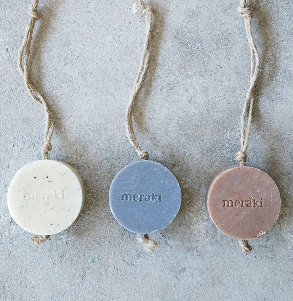 Fugt sæben med varmt vand, og gnid den mellem hænderne for at skabe skum. Massér skummet ind i huden med cirkulære bevægelser. Brug den gerne flere gange dagligt uden at udtørre huden. Sæben er mild nok til alle hudtyper. Efter brug hænges sæben til tørre i den medfølgende snor.