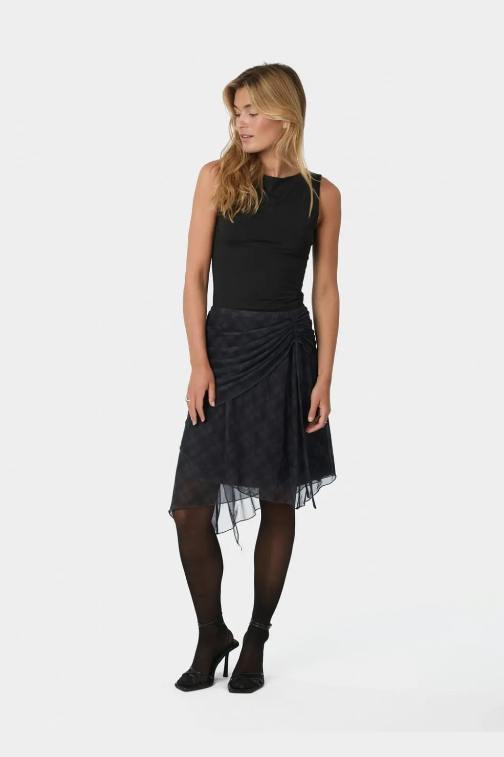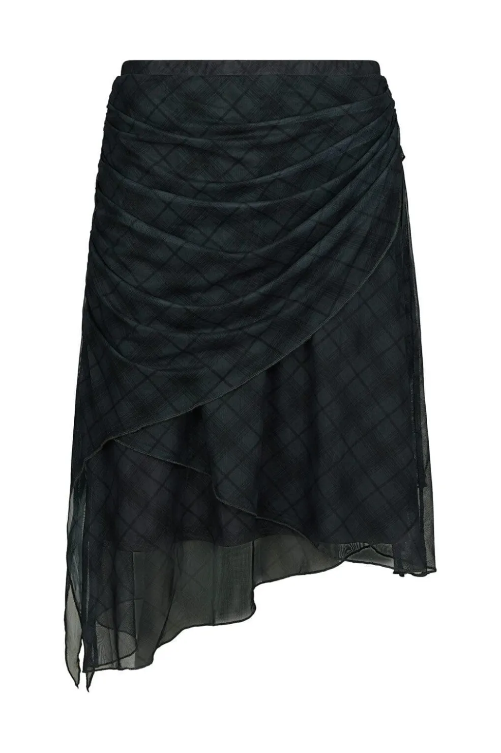 Mørkegrå mesh-nederdel fra Neo Noir med ternet mønster. Den asymmetrisk nederdel har et draperet design med flæser og ruffles, der giver et blødt fald.
