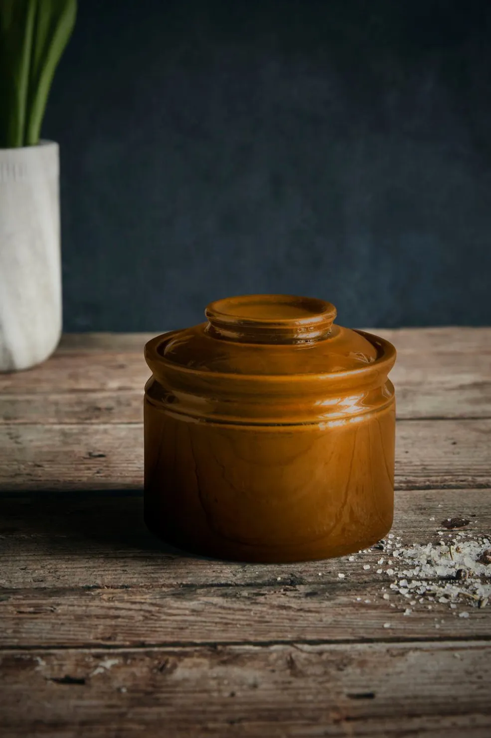 Det er en praktisk måde at have saltet tæt på, mens du laver mad. Takket være låget forbliver saltet tørt, mens krukken bliver en del af din indretning, når du ikke bruger den. Hvis du placerer krukken på spisebordet, kan dine gæster salte deres måltider og selv tilføje prikken over i’et. Krukken er lavet af stentøj og har fået en glasur i en varm retro-inspireret farve. Sammen med den glatte overflade og det klassiske design skaber glasuren et design, hvor funktion og stil smelter sammen. Hvis du vil, kan du gøre farven til en detaljefarve ved at sætte krukken sammen med den keramiske krukke i samme design.
