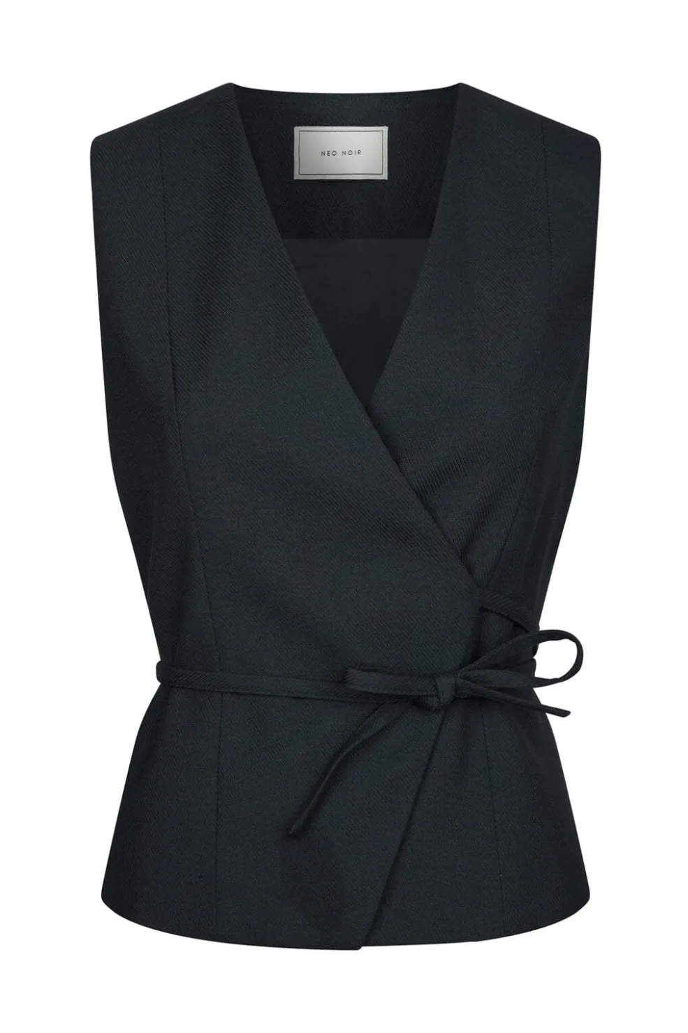 Mørkeblå vest fra Neo Noir med V-udskæring og slim fit-snit. Den har bindebånd i taljen og et meleret stof, der giver struktur til designet.