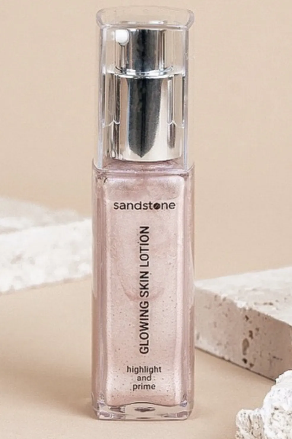 Let lotion fra Sandstone med en skinnende tekstur. Den lette konsistens gør den nem at fordele på huden, og den kan bruges både som primer og highlighter.
