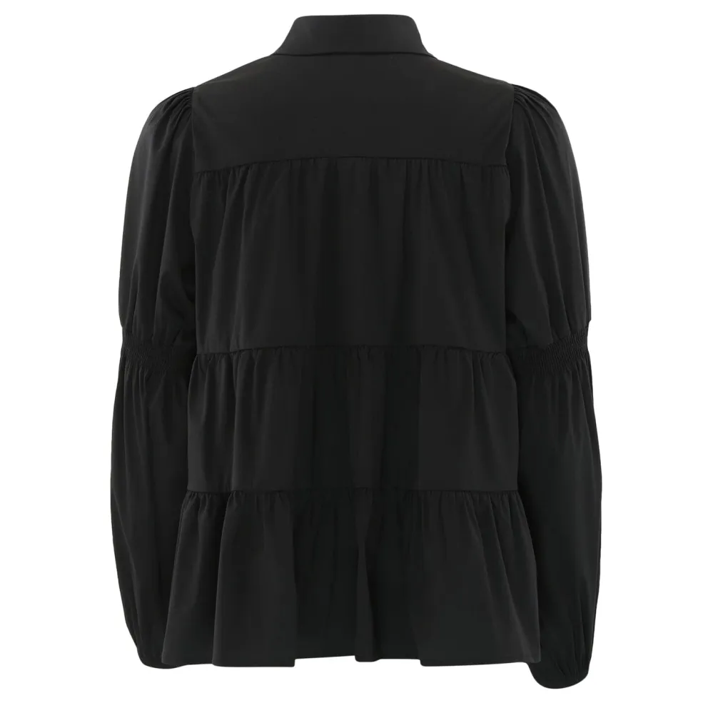Sort bluse fra Continue med skjortekrave og guldknapper langs midten. Blusen har en løs pasform og lange ærmer med samlet stof ved håndleddene.