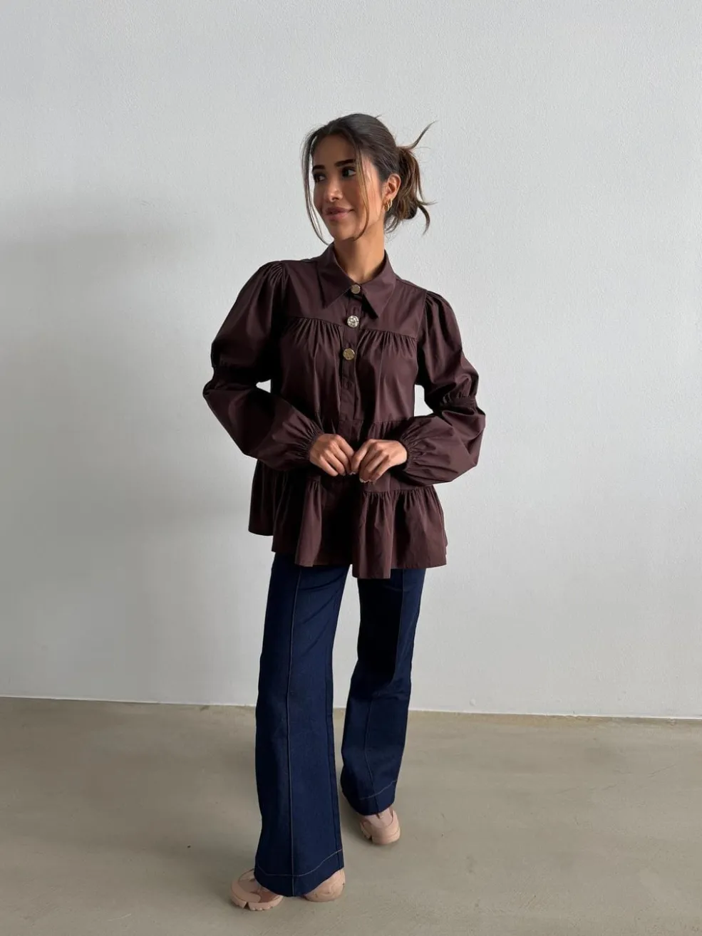 Mørkebrun bluse fra Continue med skjortekrave og guldknapper. Blusen har et lagdelt design med flæser og pufærmer, der giver et voluminøst udtryk.