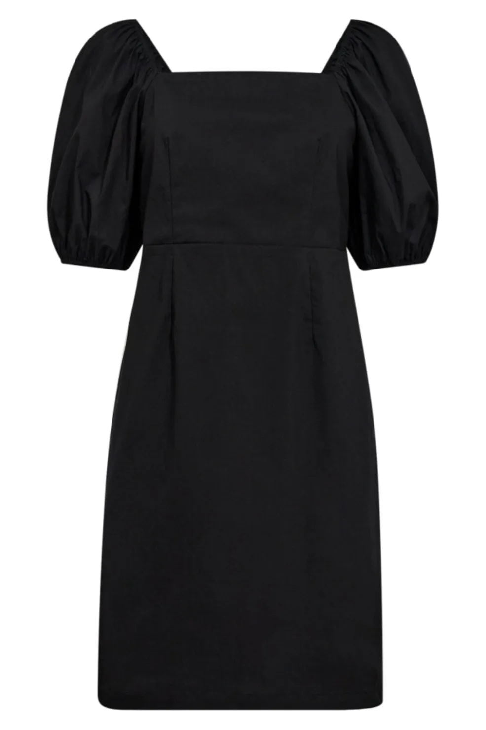 Sort kjole fra Co’Couture med firkantet udskæring og puffærmer. Kjolen har en knudedetalje ved taljen og går til knæene. Den sorte farve gør den nem at style.