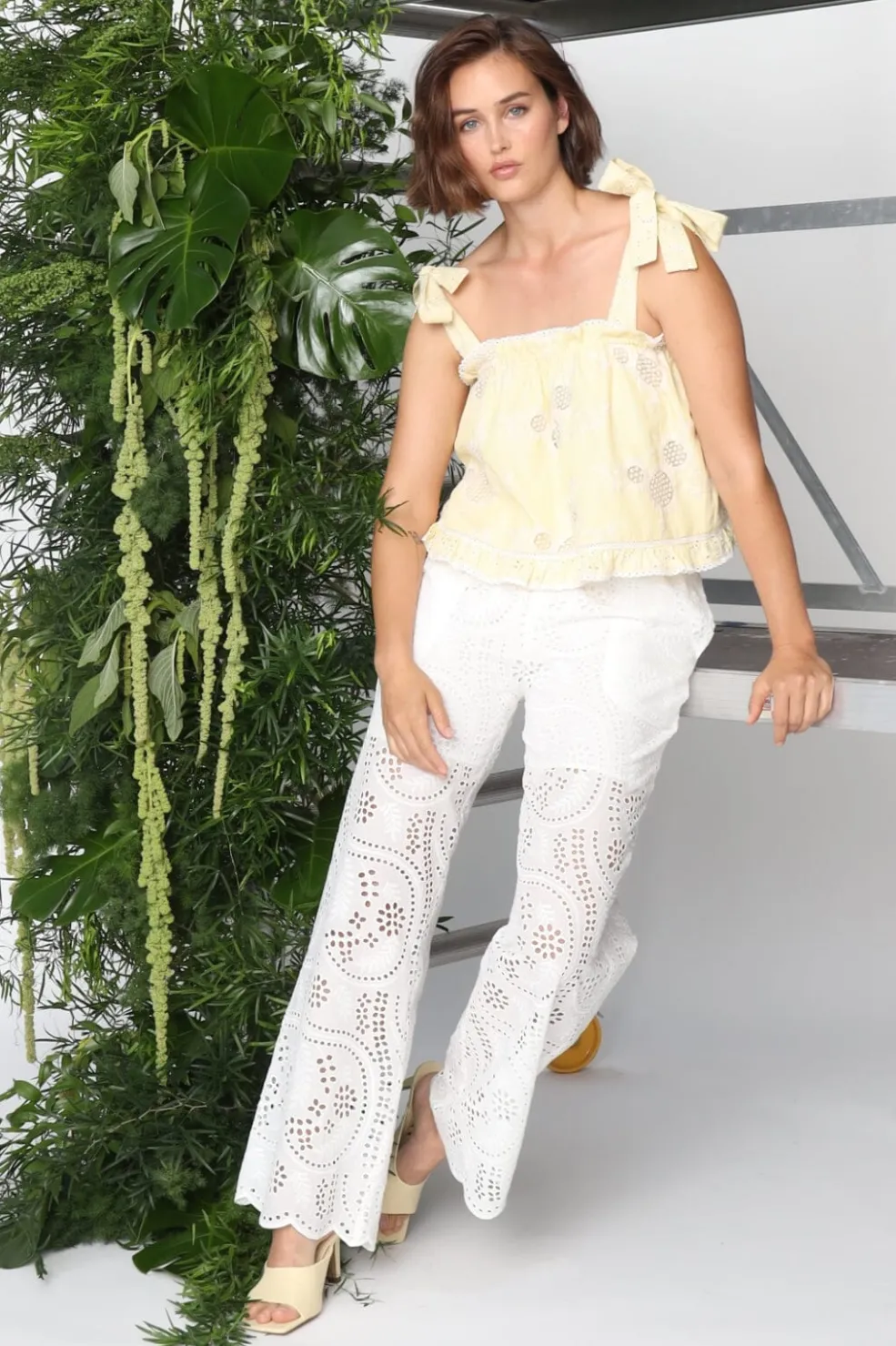 Gulstribet top fra Cras med firkantet udskæring. Toppen har bindebånd på skuldrene og flæser langs kanten. Broderi og blonder giver toppen et romantisk udtryk.