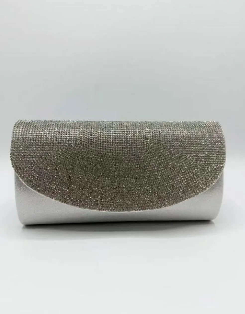 Sølvfarvet clutch fra Anobel Copenhagen med glitrende overflade. Tasken har en rektangulær form med afrundede kanter og en flap med et skinnende mønster.