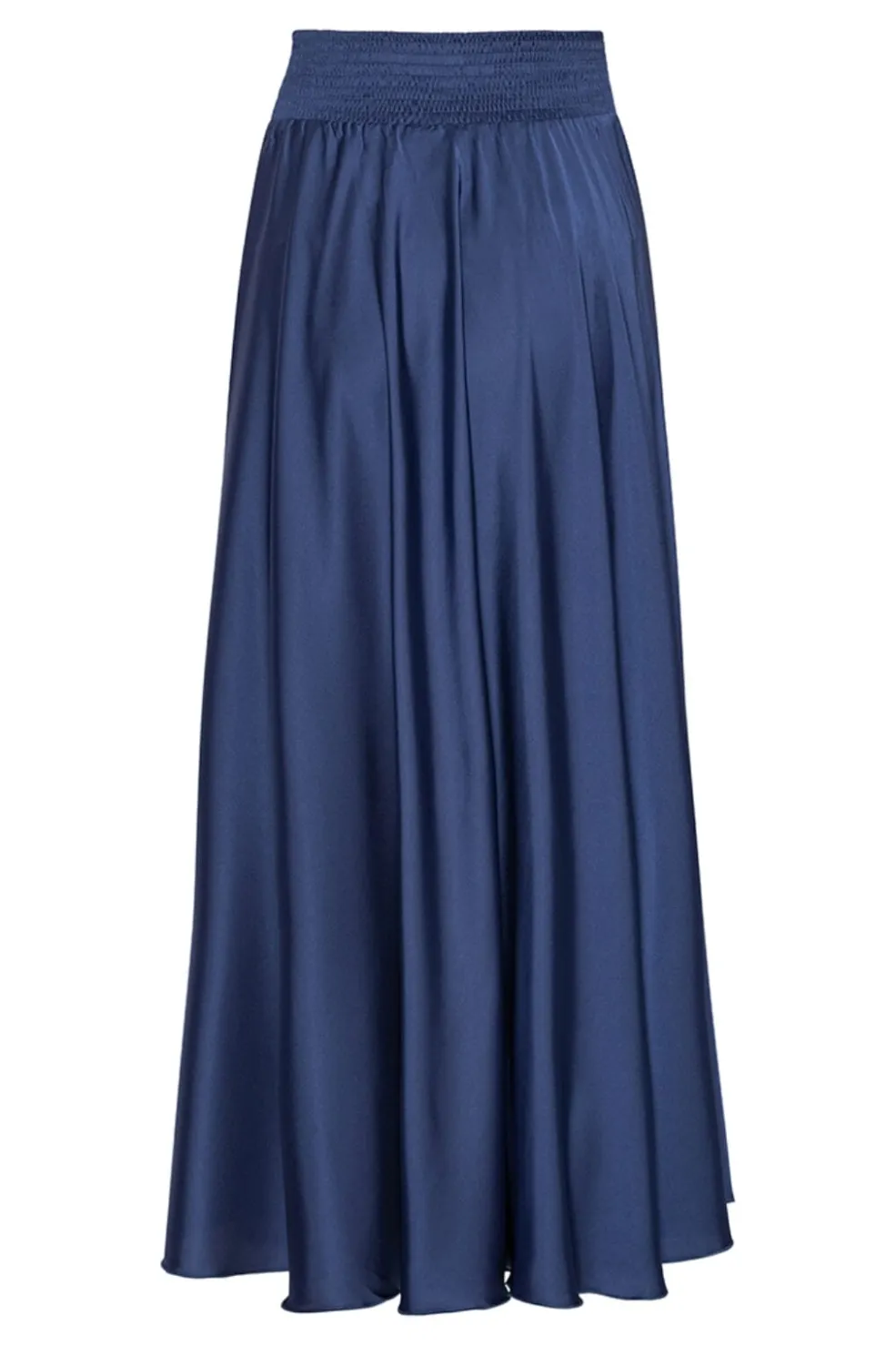 Lang nederdel fra Karmamia i mørkeblå satin. Den har en løs pasform med elastik i taljen og et glat, flydende design med plisseringer.